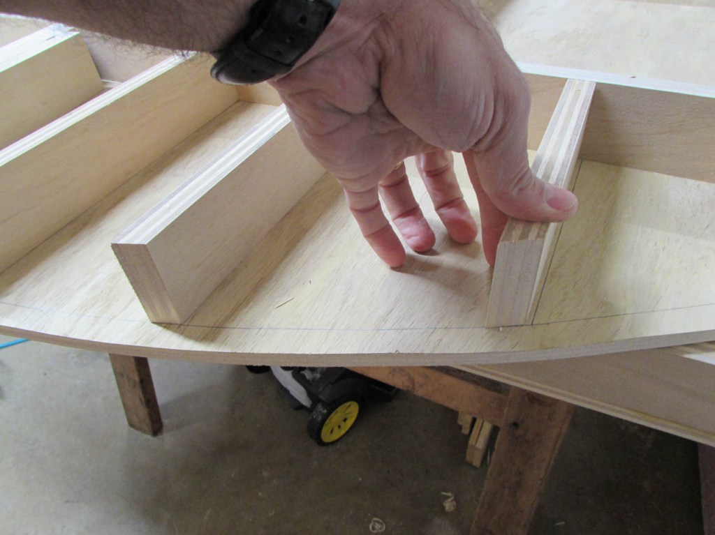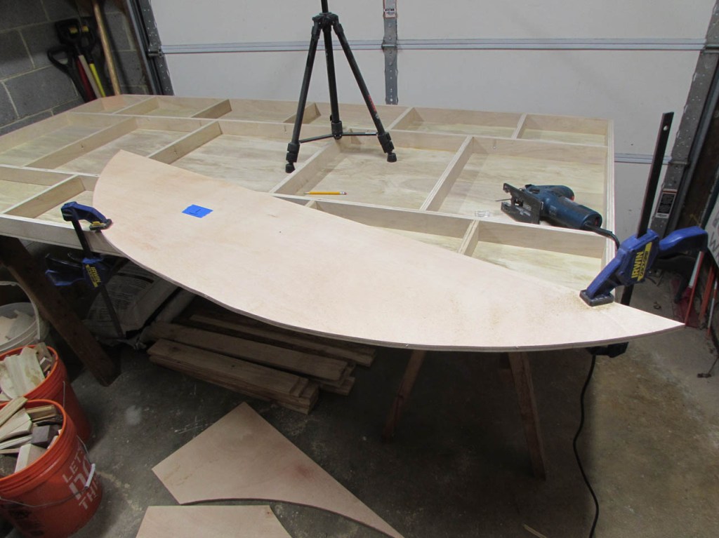 When dry, I ran the router along the curved edges to make all the sides perfectly flush. Here is the final product. I have my ribs set in at 12″ for the locations of my legs, and a bunch of ribs to make the curve smooth.