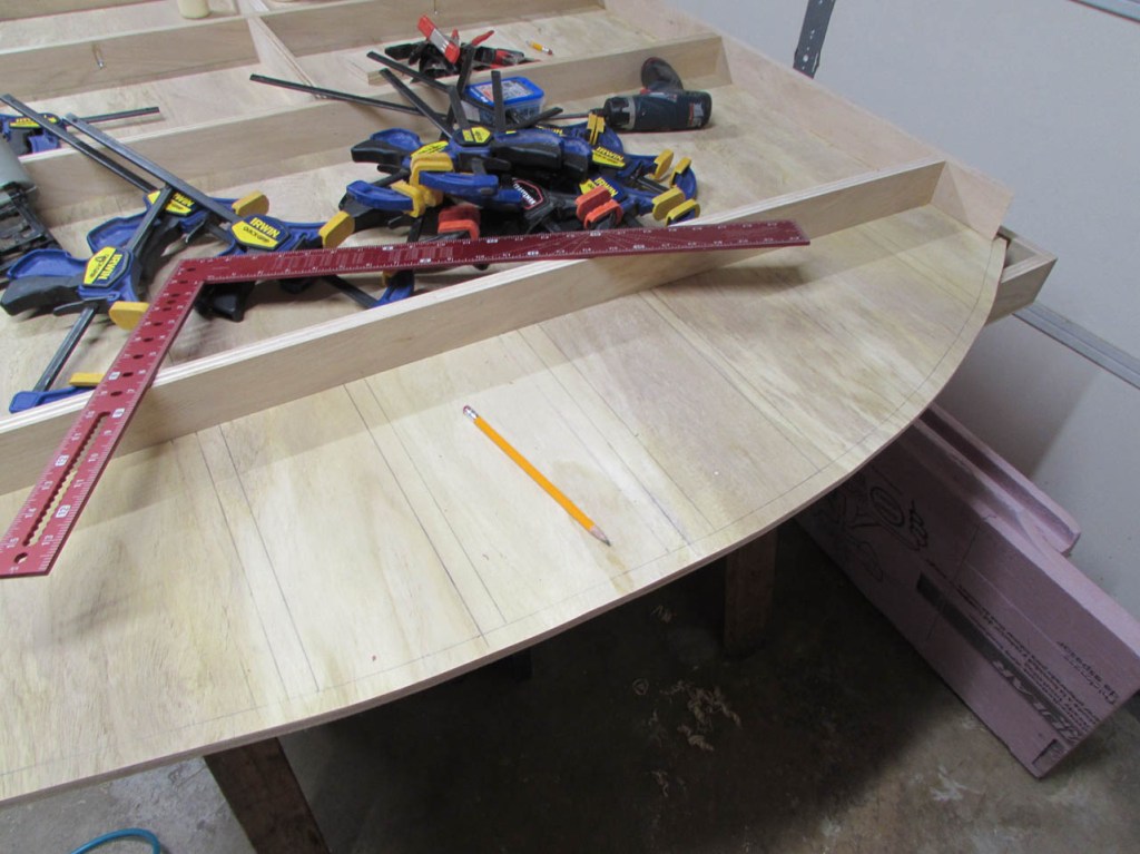 Back at the shop, I did a quick preliminary layout of the structure. This was mainly to figure out where to start laying out the legs. I want them to be in at least 12″ from the edge so that there is more support in towards the middle then keeping them at the edges. I also did not want anyone kicking them if they got too close. I am sure some of this will change as I figure out what I am doing with the curves.