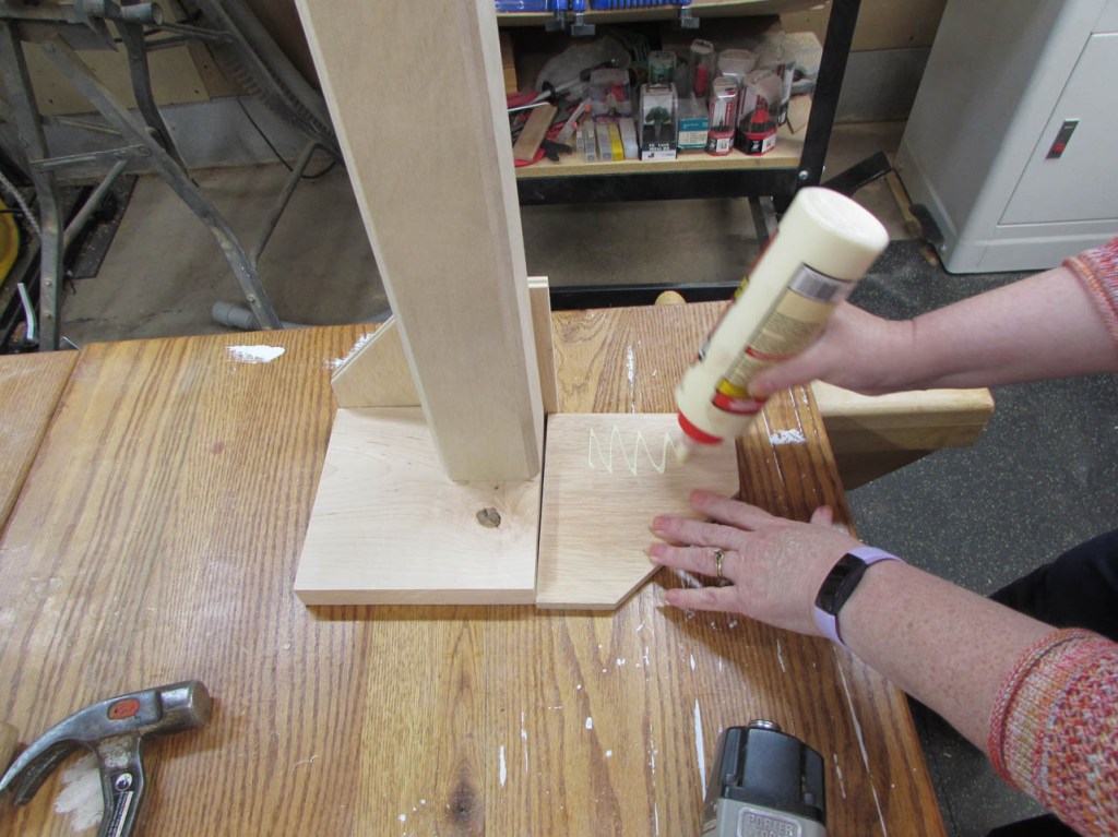 Once she could see where the glue needed to be applied, she spread on the glue and I attached the gusset with some 3/4″ brad nails.