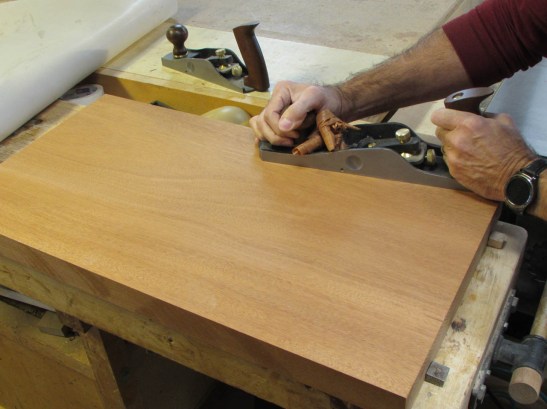 After determining which corners were the high spots, I started to bring them down with my jack plane.