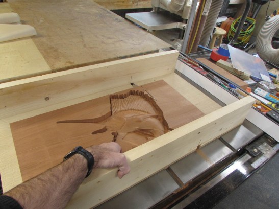 The reason I had to leave the edges at full depth was that I am also carving some song lyrics, from their wedding, on the back. If I had carved away the edges, the fish would have not laid flat and I would have had to block it up very carefully to achieve the same effect.
