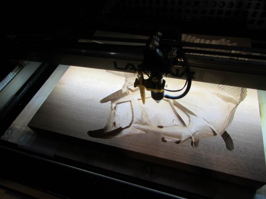 As you can see, in the picture below, my laser has an additional probe on the left side that is used to sense how far above the surface the tip of the laser lens is. This is used to auto focus the lens for etching and cutting. The probe is not easily removed and will smack into the taller piece of wood, that I just removed since it barely clears the fish tail. I actually ran a simulation of the etching operation and it hit the board and moved it. That was why I went back to the shop and cut that section down.