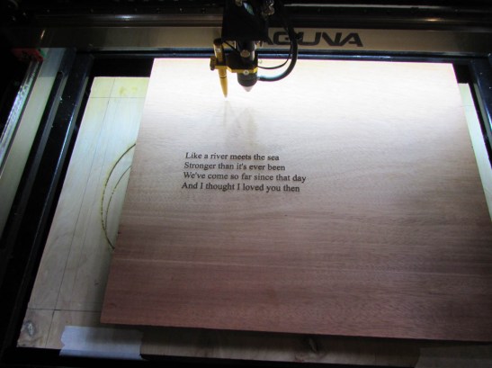 After focus and alignment, I ran a very quick, low power pass of the laser to make sure there were no problems. If there had been a problem, the etch was shallow enough that I could sand it away and start over.