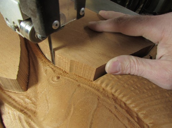 Time to remove the excess wood around the edges. But first, I need to do one of my least favorite shop tasks, changing the bandsaw blade. I am pulling off the old blade because it is course and fairly dull. I am loading in a 1/4″ – 10 tpi blade, hoping that it will give me a fairly smooth cut.