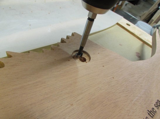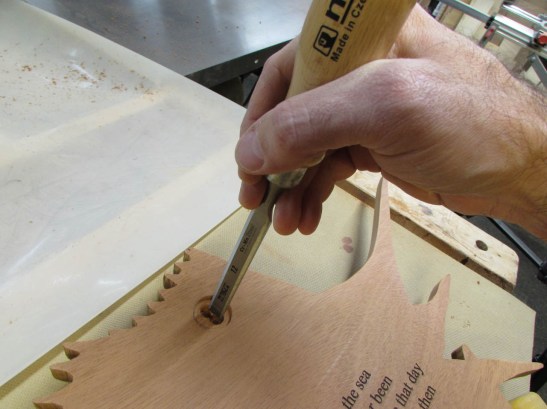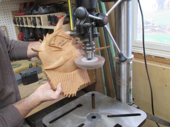 Balancing the fish on a block, to keep the back flat, I bore a 1″ diameter hole, 1/16″ deep.