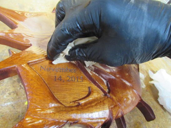It was just easier to leave the board flat. I located the best location on the back of the fish and marked the center of my lyrics then centered the lens over that spot and started the etch. I used the same power and speed settings from the date on the opposite side, since I liked the final outcome of that.