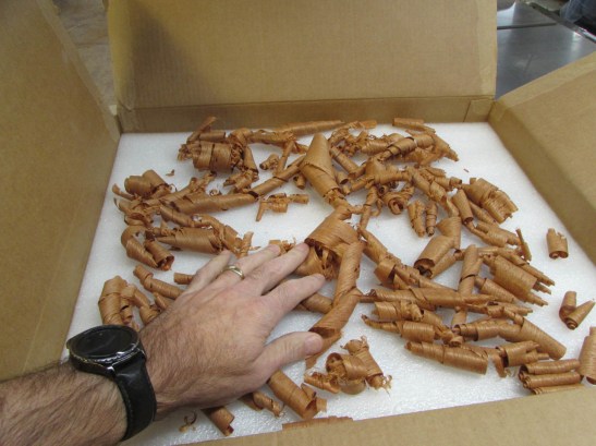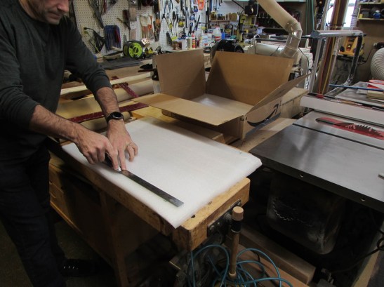 A solid piece was placed on the bottom and top as well, making 4″ of foam in total. I even threw the mahogany planer curls on top to fill out the empty space…