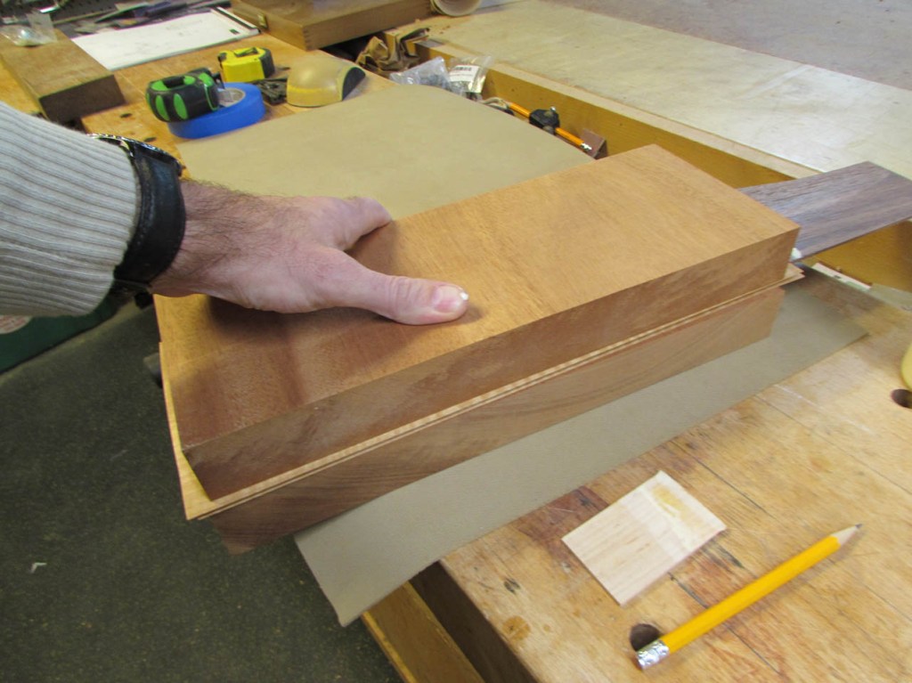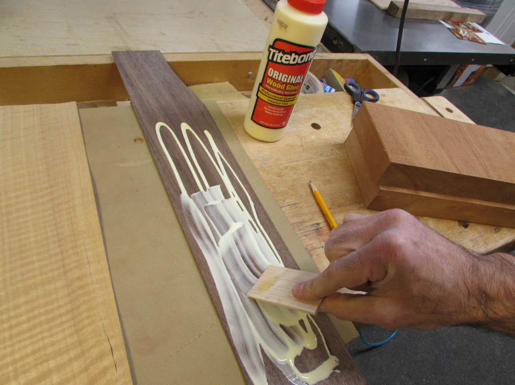 I lay the assembly onto one block of mahogany, then apply the second layer of veneer.