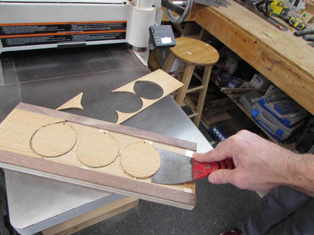 The hardest part of this project so far was removing them from the double-sided tape without damaging them. I need the tape to be strong enough to keep everything in place while the CNC cuts it. Removal takes a dull putty knife and a lot of patience. Alcohol would help dissolve the glue on the tape, but I don’t know what it would do to the glue on the veneer…