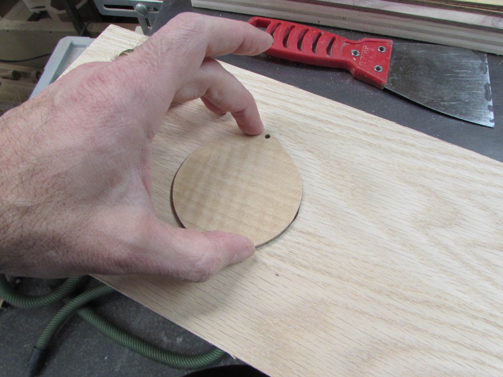 My friend Chris saw these and wanted a custom Christmas ornament for each of his girls. Since I did not have any more oval blanks of Dave’s, I had to make my own. Dave gave me a few sheets of the curly maple veneer for test cutting on the laser, so I grabbed one of them and cut it in half. For the core of this ornament, I have a left-over piece of walnut that is about 1/8″ thick. It is actually left over from a guitar that I made with Chris’ brother Kyle. The walnut was cut and dried by their grandfather. He has since past away, so it is really cool to make a gift for the girls that their Great-Grandfather helped to make.