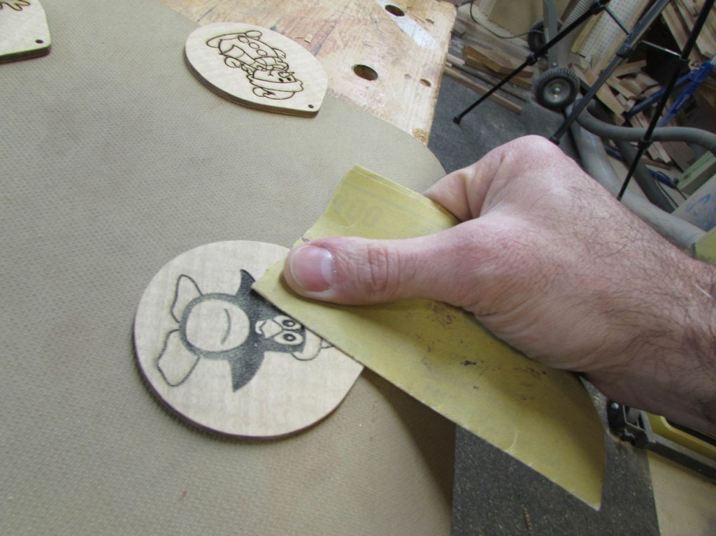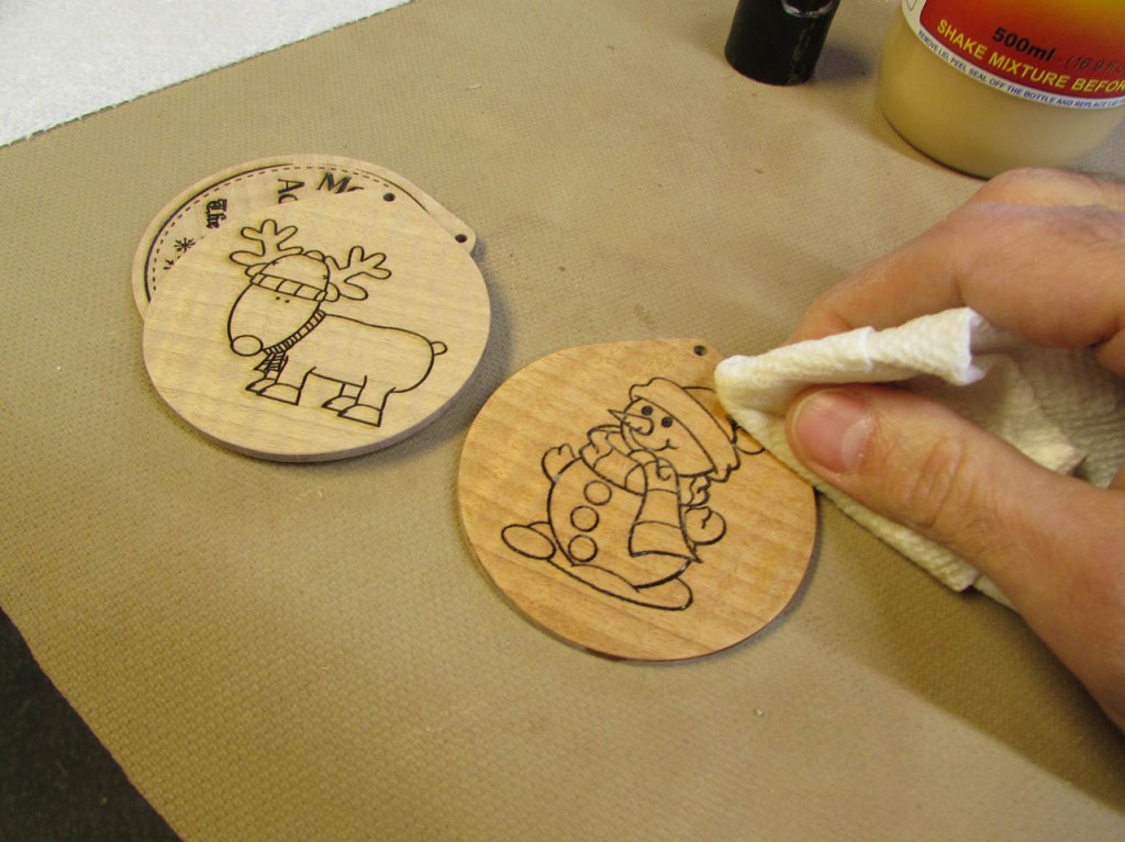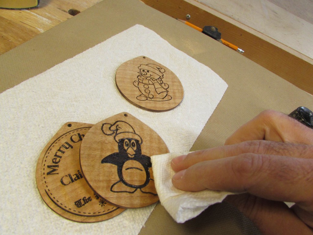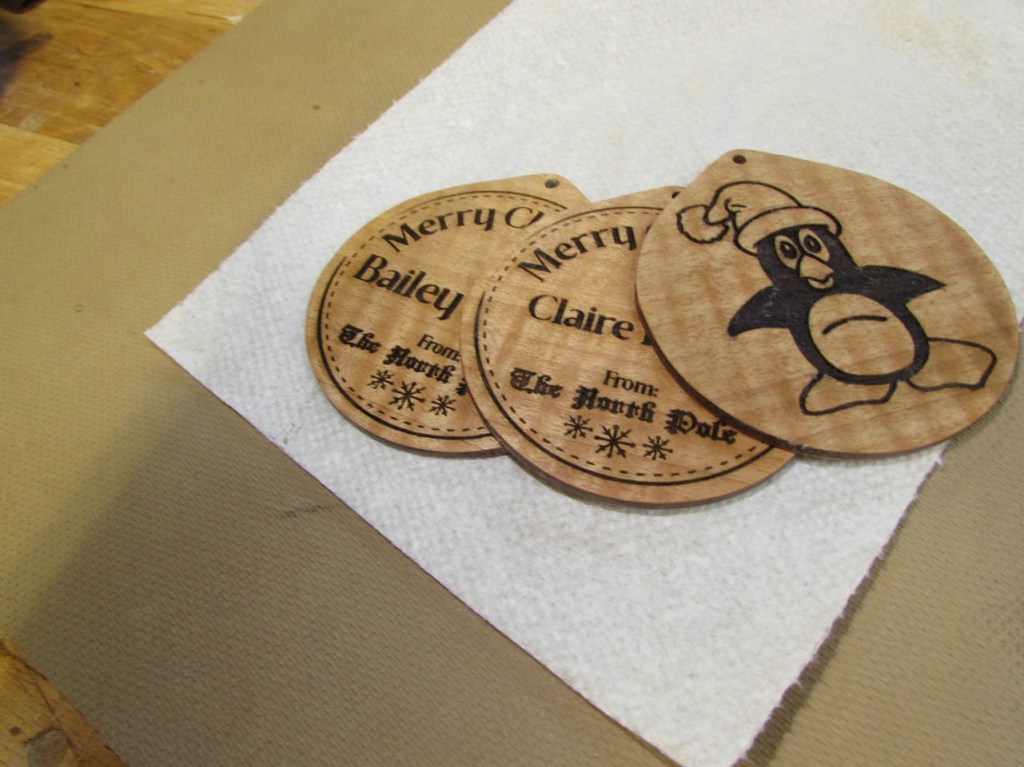 After the animals were cut, I flipped the ornaments over and engraved the North Pole stamp for each of the girls on the back. And, yes, it would have been easier and faster to laser cut the ornaments out and not bother with all of the CNC work, but I wanted to accurately engrave the back sides as well and I did not want to clean the burn off all of the edges. I wanted the walnut to be visible.