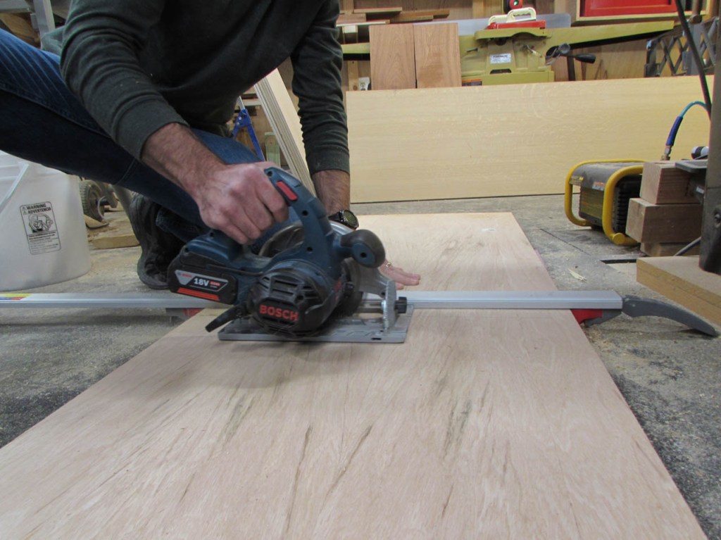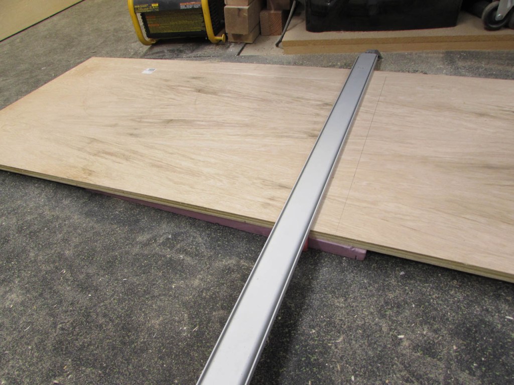 To break down the plywood, I lay a piece of rigid foam on the floor and use a straight edge and a circular saw to get the length close.