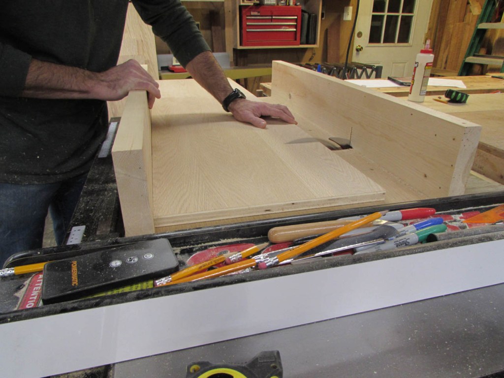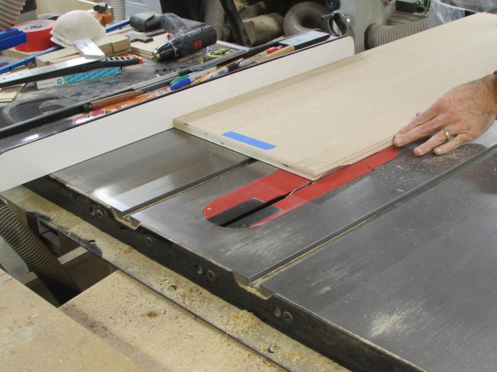 I was originally going to use my dado blade to cut the 3/4″ wide dados for the shelves, but my SawStop table saw started giving me an error when the dado blade was installed. Since I was working over a holiday weekend, I couldn’t wait for tech support so I put the regular blade back in and filled the gap in my cross-cut sled so that I won’t get any tear-out on the face veneer of my sides. (The problem was resolved a few days later when I got my call from tech support)