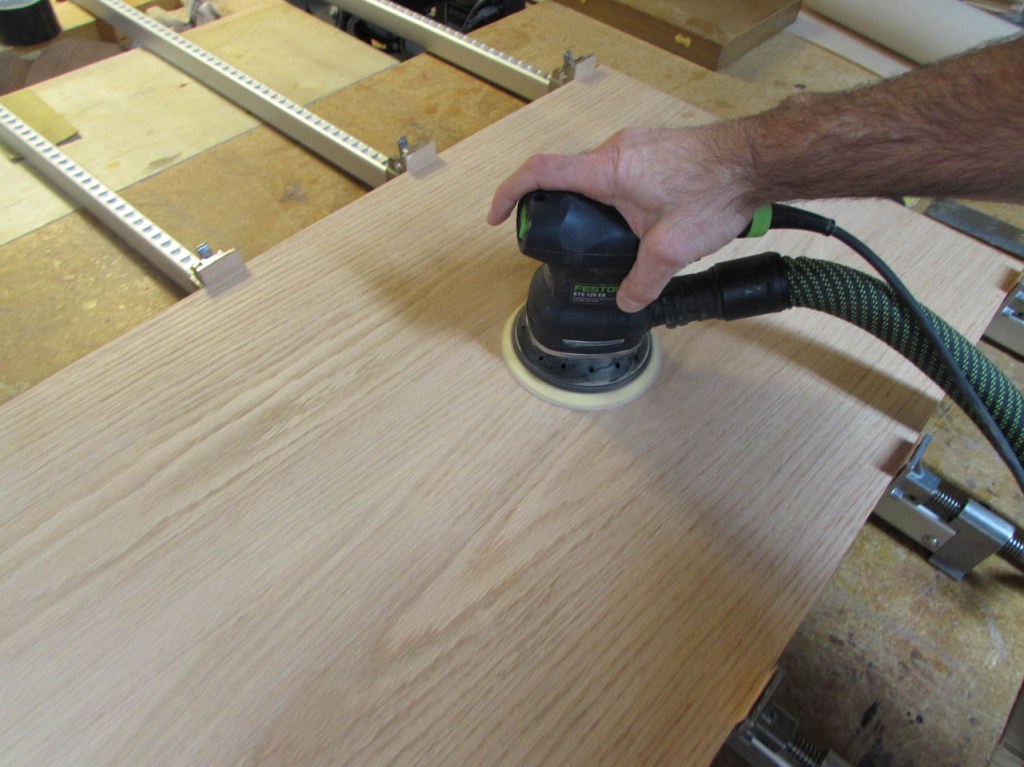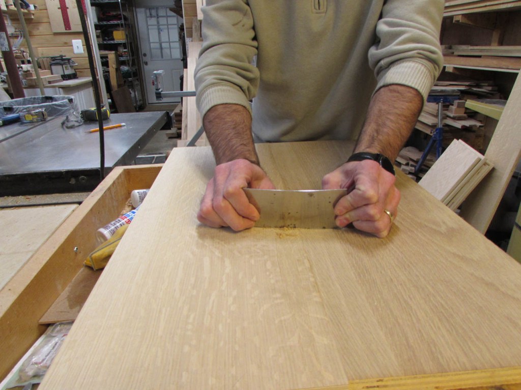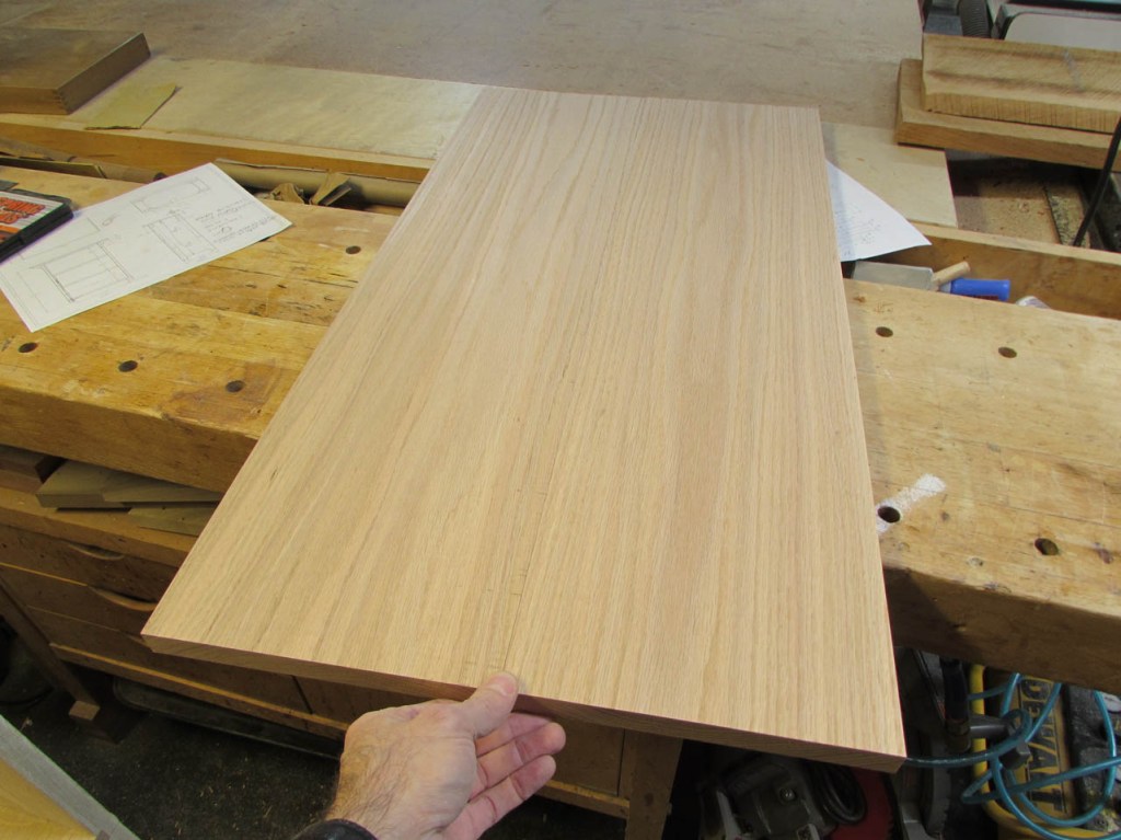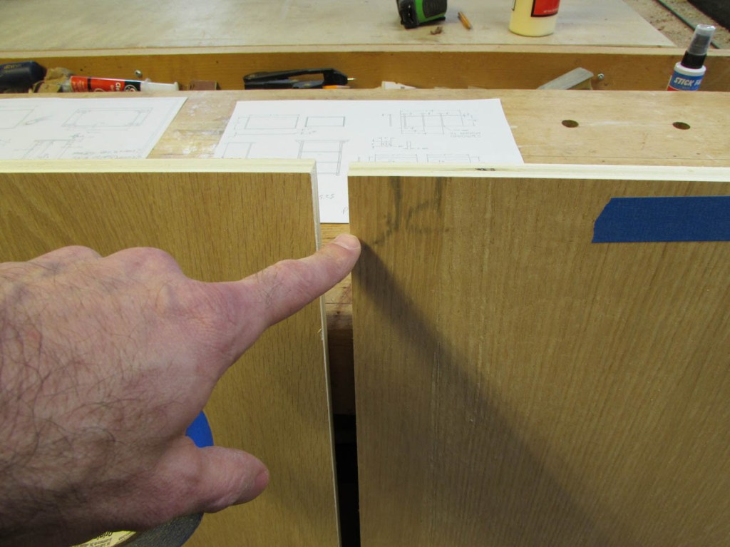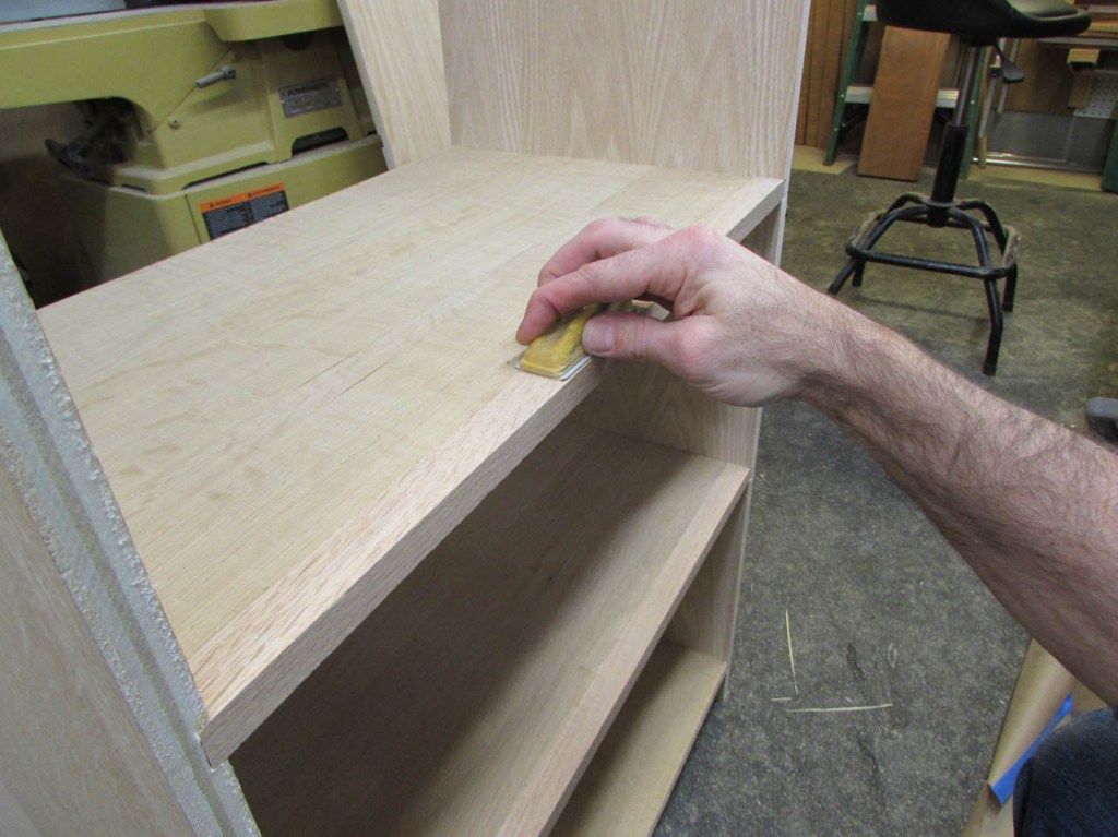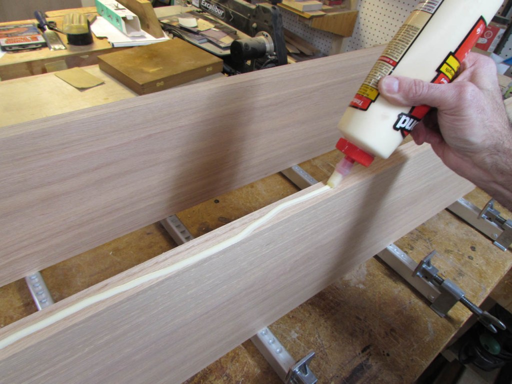 The one shelf was a bit thinner than the rest so I had to blend the seam with a card scraper, but it looked good when sanded.