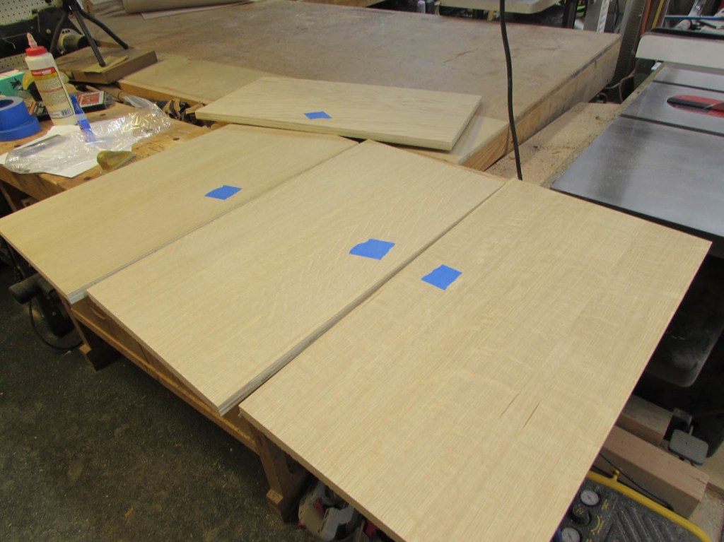 My two bottom shelves are going to be the glued-up panel and the piece with a small defect in the veneer. I marked them on the bottom face so that I remembered them as well…