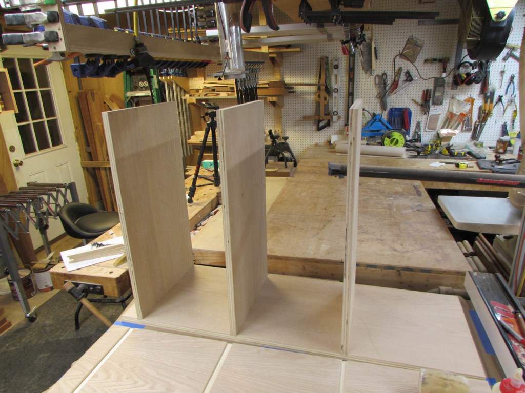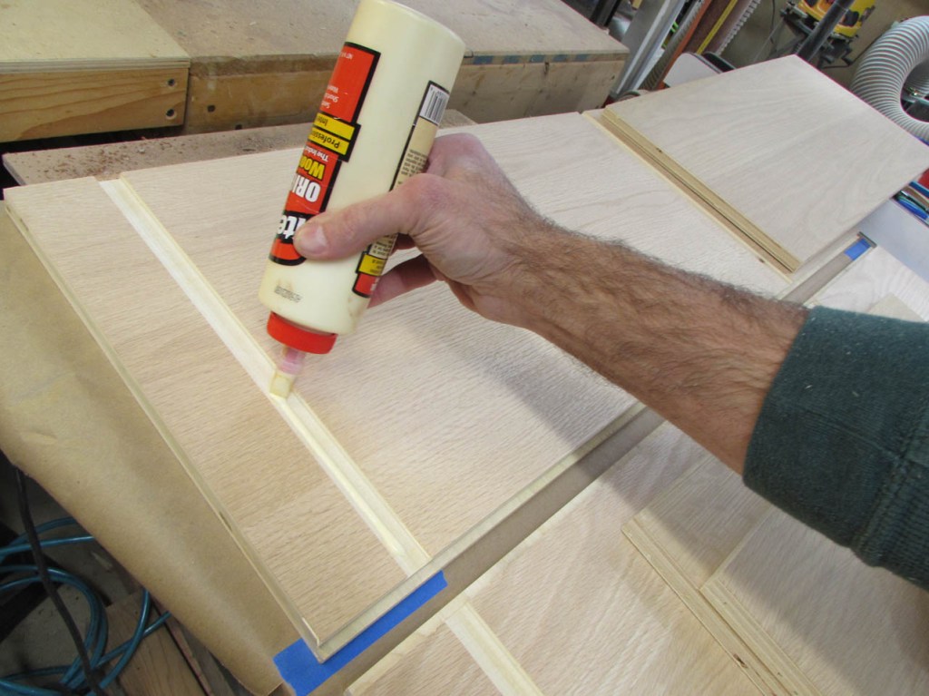 I had enough plywood for all but one shelf to be made from one piece. I had to do a glue-up of two thinner pieces for the remaining shelf.