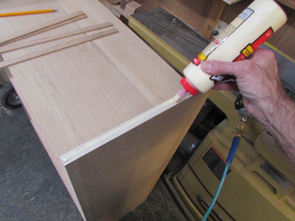 I was not happy with exposed plywood on the bottom of the shelf. I know finish will be applied to seal it, but if someone drags the heavy shelf around, they could tear at the veneer. To help prevent this and avoid any ground contact with the plywood, I cut some 1/8″ thick strips and glued them to the bottom. I will have to remember to add 1/8″ to the length of my face frame later.