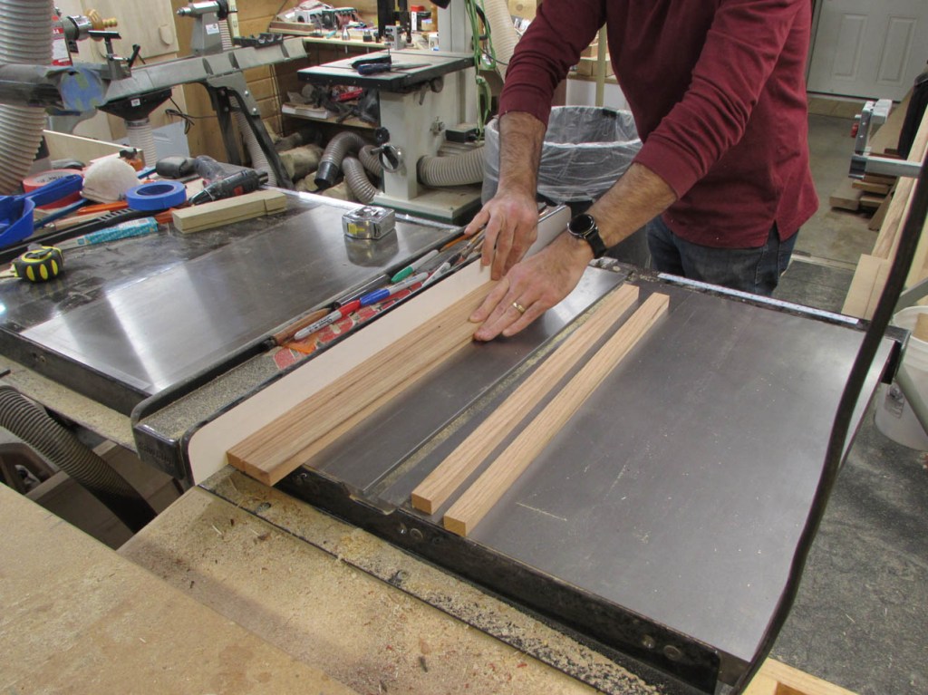 To get rolling on this project, I pulled out all of the 3/4″ plywood that I have in storage. I can buy new stuff at the local big box store, but some of my scraps are a much better quality. I especially like the quarter-sawn stuff that I am using on the sides. The sides and shelves are going to be made from 3/4″ plywood, So I set the fence on the table saw and started ripping everything down to the correct width.