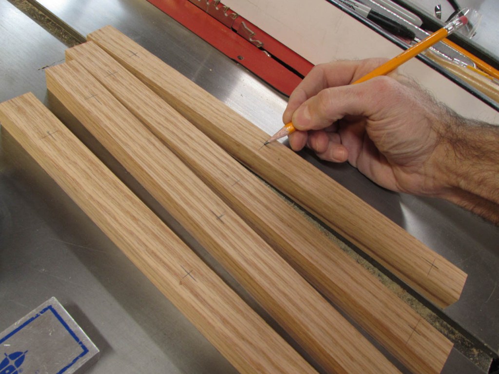 The sides are quarter-sawn on one side and flat-sawn on the other. I want the quarter-sawn on the outside so I mark the good face with a piece of tape so I don’t get confused when I start cutting dados for the shelves. I also have an ink stain on one board that I want to be mounted in a location that will be covered up later. Placing the tape at the top end will help me to remember that as well.