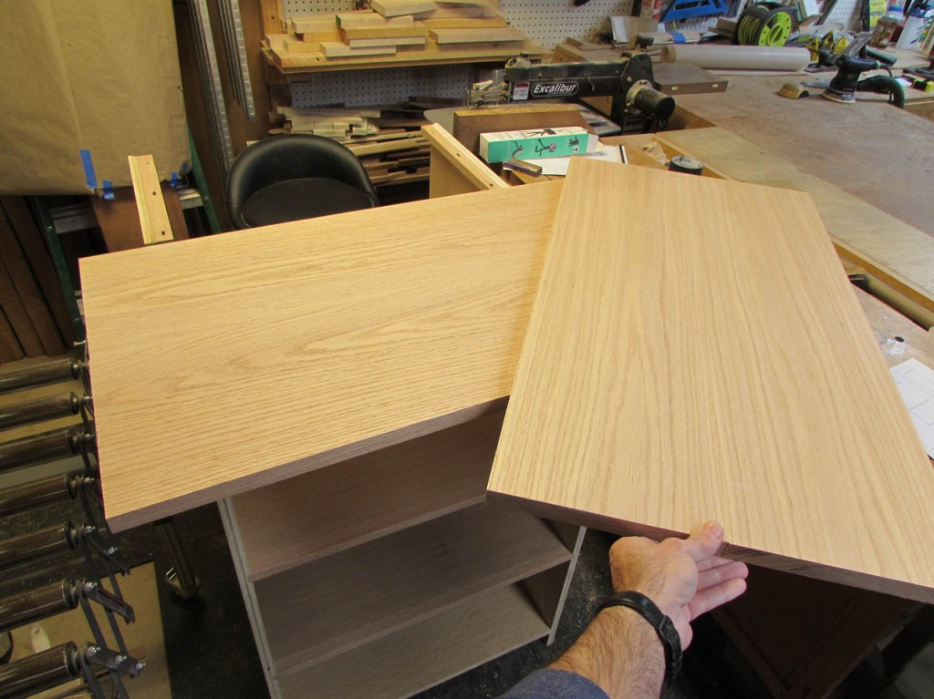 The tops seem huge for the shelves, but they will look better once all the rest of the solid wood is in place.