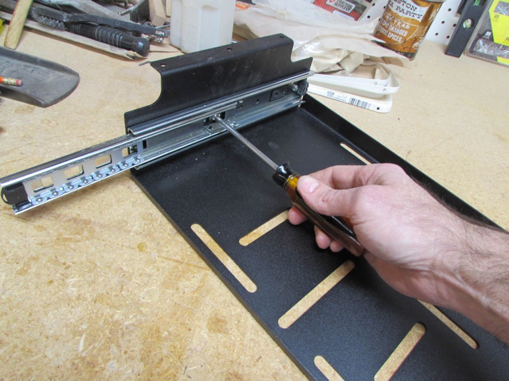 Next step was to separate the parts of the drawer slides by pushing down the black lever and pulling the bracket out of the slide.