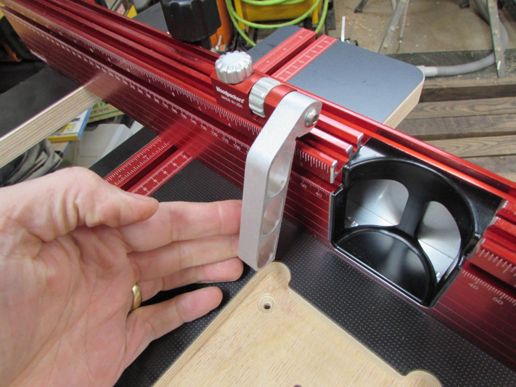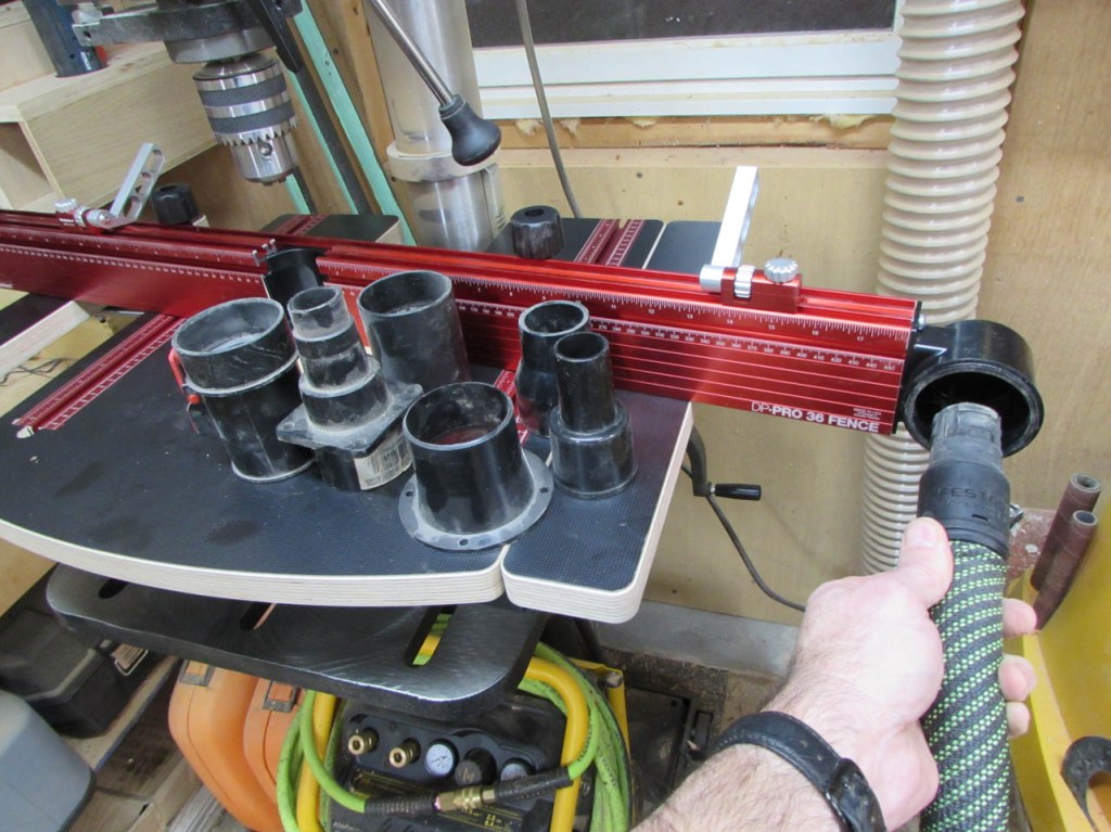 This was my only disappointment with the table, all of the ads on Woodpecker’s website show a green vacuum hose, leading me to believe that it was a Festool hose. I was wrong, it is 2-1/4″ for a standard shop-vac hose. Unfortunately my only hose that will fit is not very flexible and keeps the fence from going all the way back. Also, I don’t like necking the big hose down to the smaller one, doubling the length of the hose run. I believe that really decreases my suction. Not a deal-breaker, just unexpected. Hopefully Woodpeckers will make a few different adaptors in the future.
