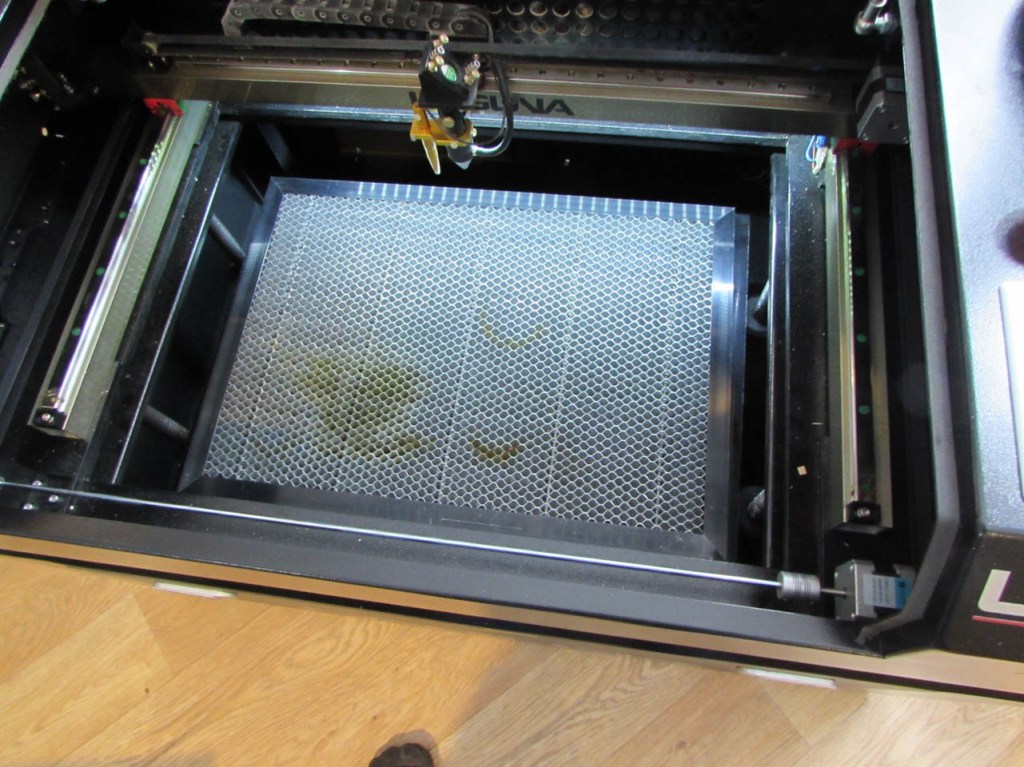 My laser, the Laguna PL1220, comes with a standard honeycomb to lay your materials on while cutting. I am not fond of using it because it moves and I cannot mark locations on it. I typically remove it.