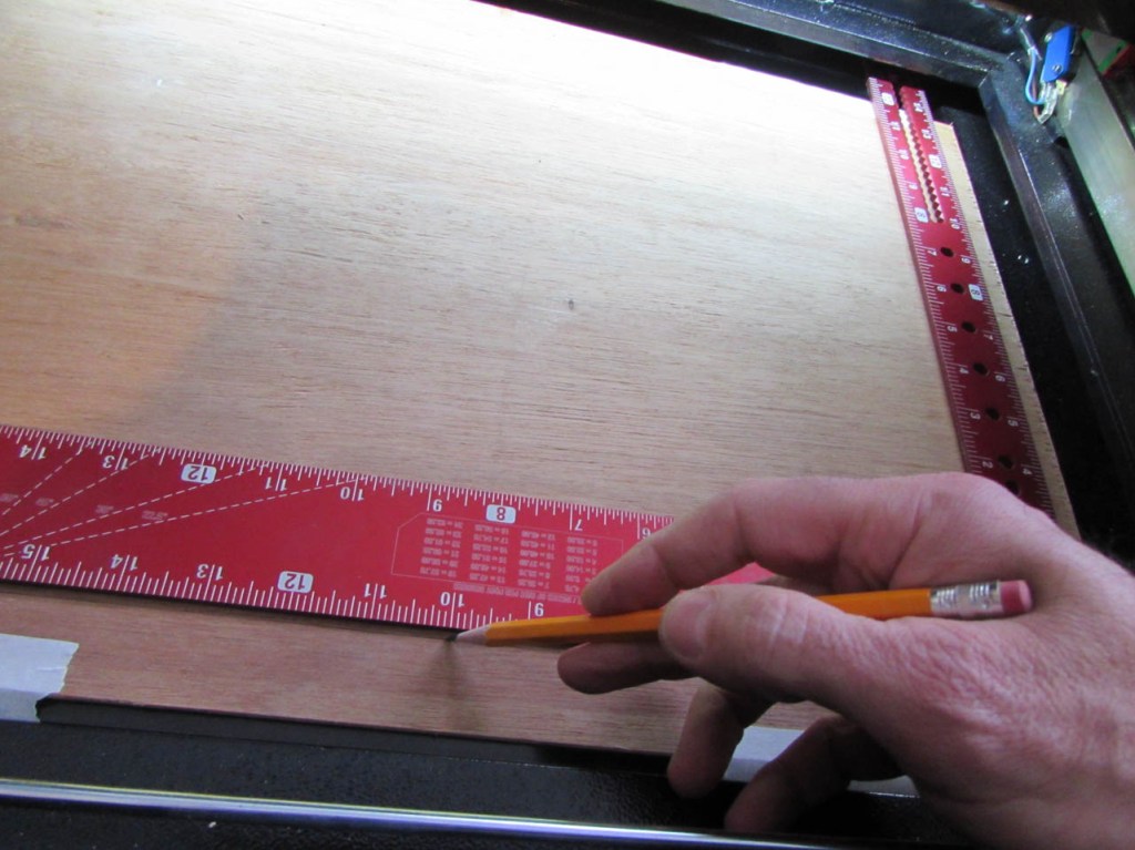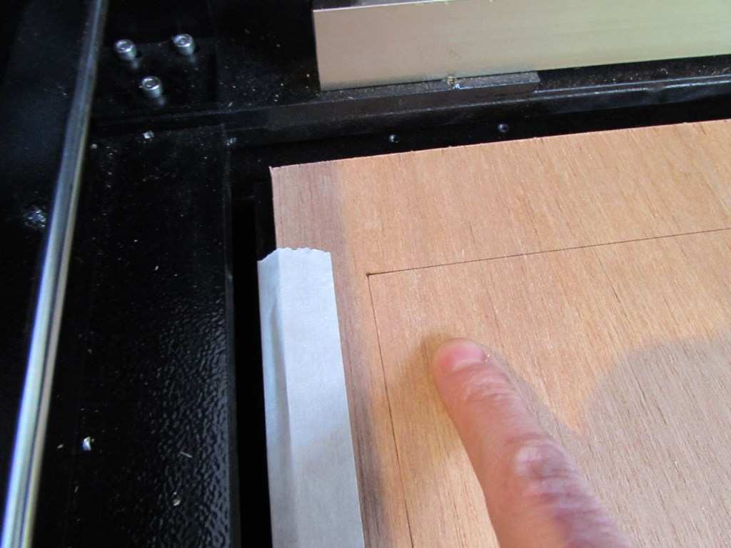 I can create a vector file that draws a grid with dimensions and laser it onto the plywood. This would enable me to easily align material to the table for accurate engraving. I am not in the mood to do that today so I just locate the middle of each side and draw a center line in both directions.
