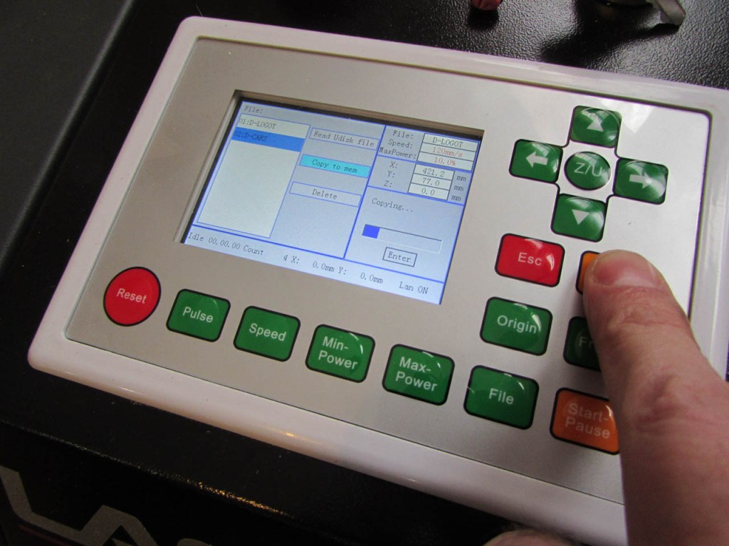 The first thing I do is send my laser to a corner and press the “pulse” button and hold it down while I move the laser around the perimeter. The “pulse” manually fires the laser. This is typically used to align all of the mirrors. If you are really bored, you can use it like an “Etch A Sketch“.