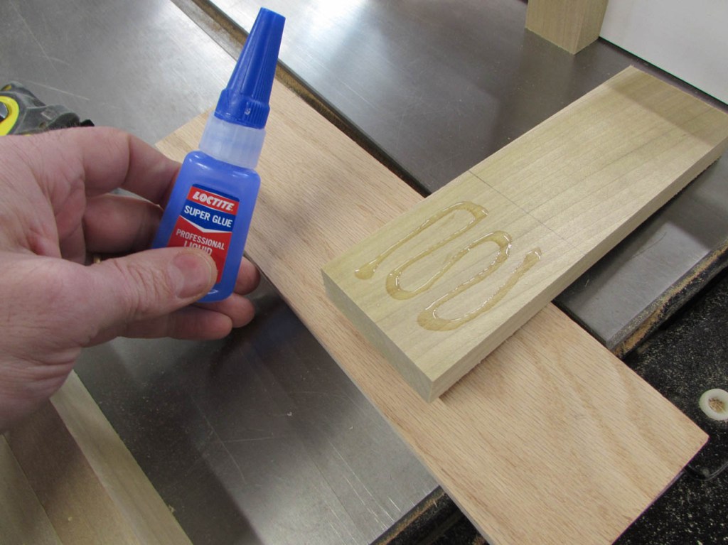 I do not have a tenoning jig to safely cut the half lap, but it occurred to me that I could make one with two blocks of wood and some CA glue.