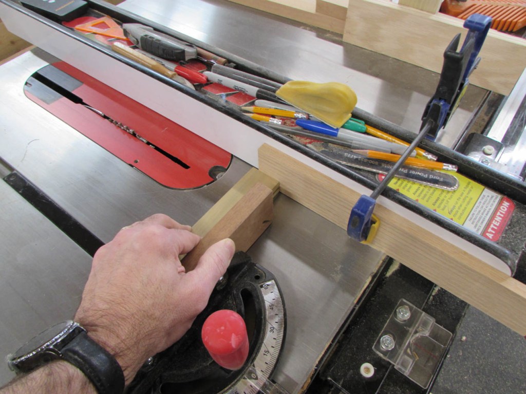 To cut away the rest of the half-lap, I attached a stop block to my fence and used my miter gauge to cut the rest of the notch.