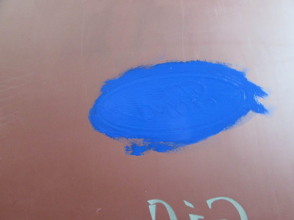 The glue is still drying so it was time to experiment. Originally I wanted to leave clear glass behind when removing the coating on the back. This was because I intended to paint the glass and have a solid color there. With the glass etched, I do not know what it will look like. I decided to use some blue and red tape to simulate paint and see if there was any color contrast through the etching.