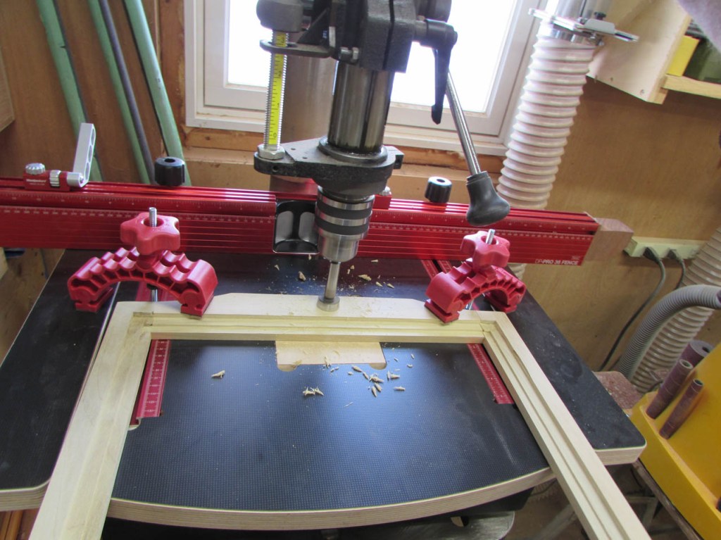 I got to use my new knuckle clamps, on the drill press table, to hold down the frame. They were really useful since the length of the frame made it difficult to hold in place while drilling a small recess for the mounting plate.