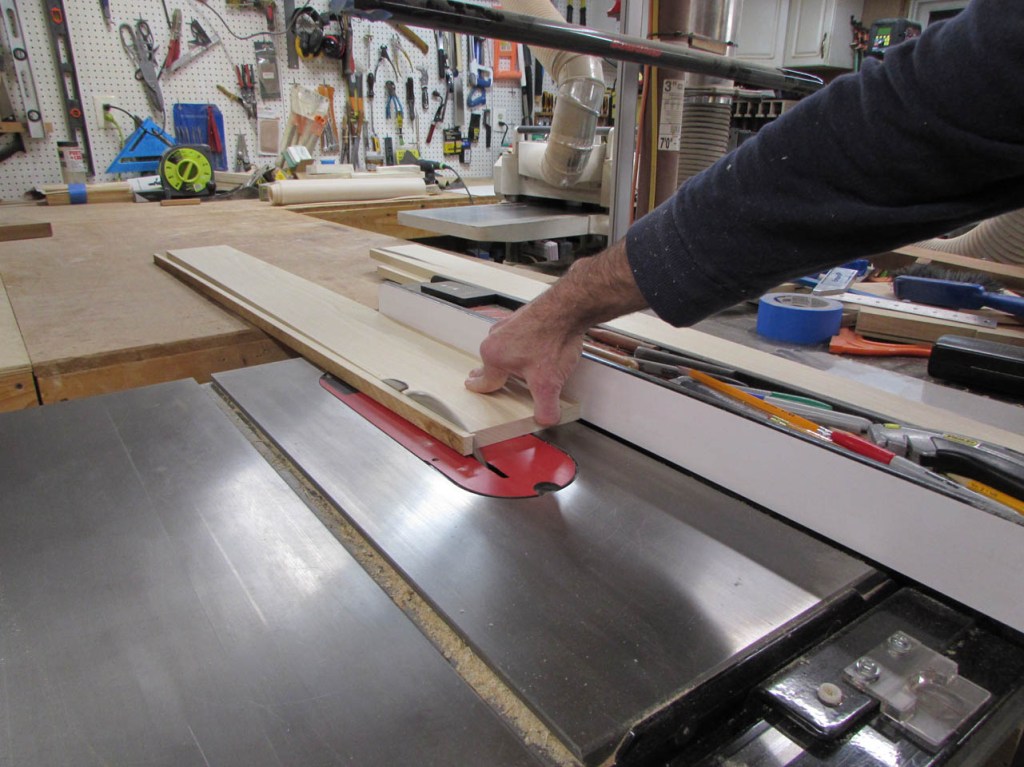 On the table saw, I cut three of the boards to 4-1/4″ wide and one of them to 5-1/4″ wide.