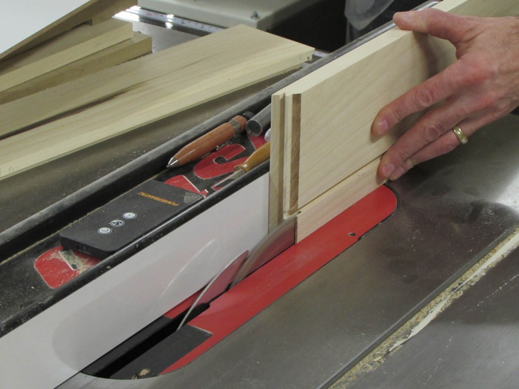 I used the table saw to cut a 1/4″ deep rabbet around the bottom of the outer frame.