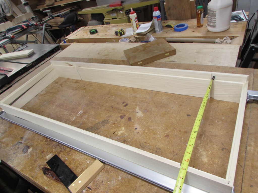 With the frame clamped up squarely, I could measure and cut the dividers.