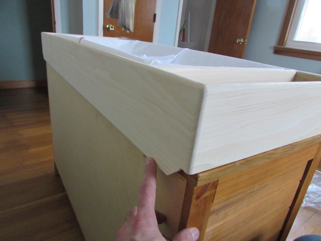 This is how it will fit. I didn’t want to cut a slot for it because I wanted it to sit flat on the dresser, not float above it and then bow down when any weight (like a baby) was applied.