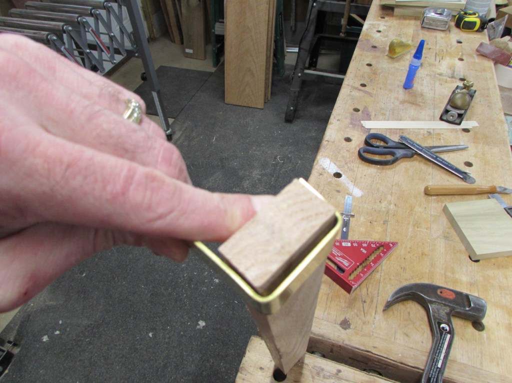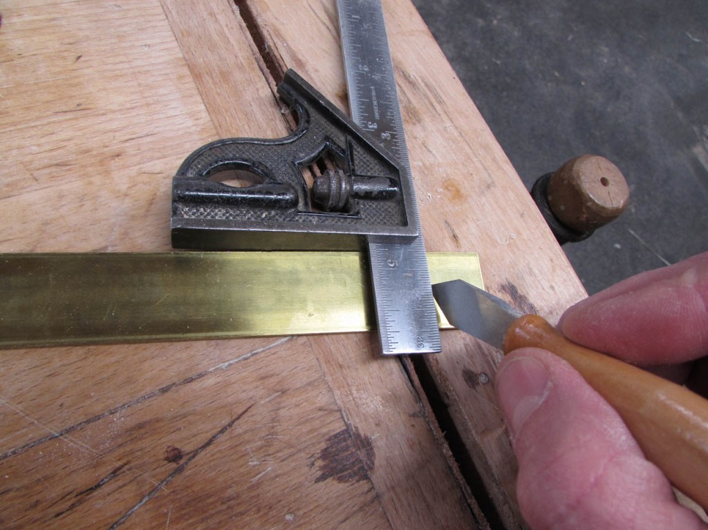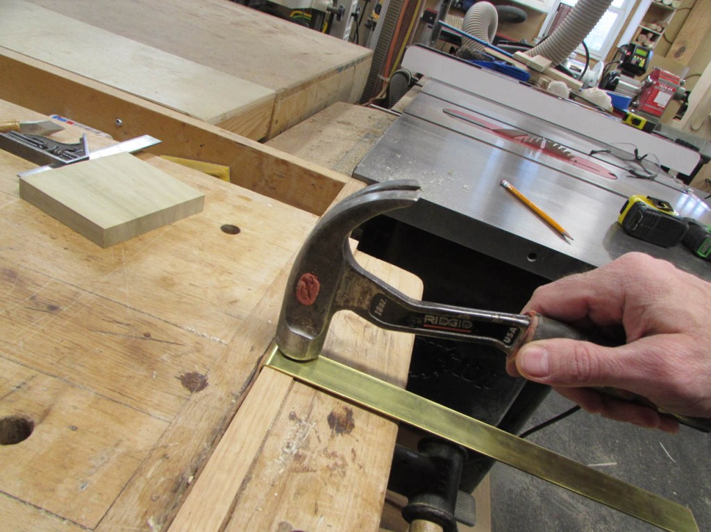 To bend it, I scribed my first bend point 3/4″ from the end and clamped the metal against a piece of oak, right at the mark and squared it up.