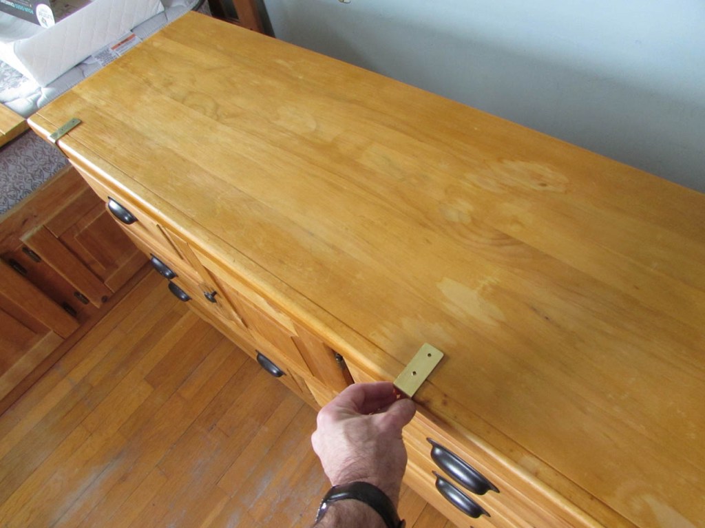 I will locate one under each divider so that I have something to screw it into. The brass should be flexible enough to allow me to hook onto the front then slip the back flange behind the dresser and screw it into place.