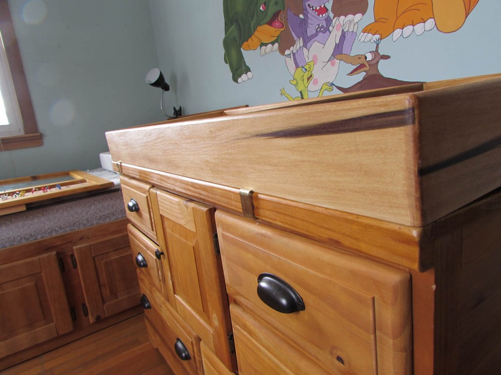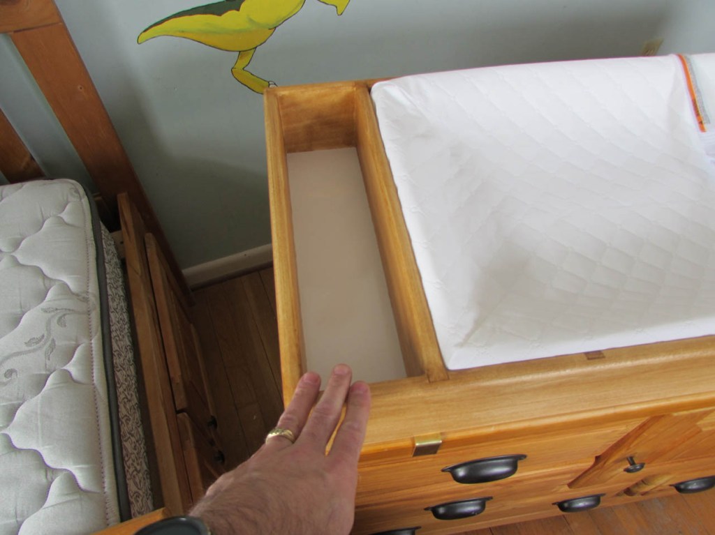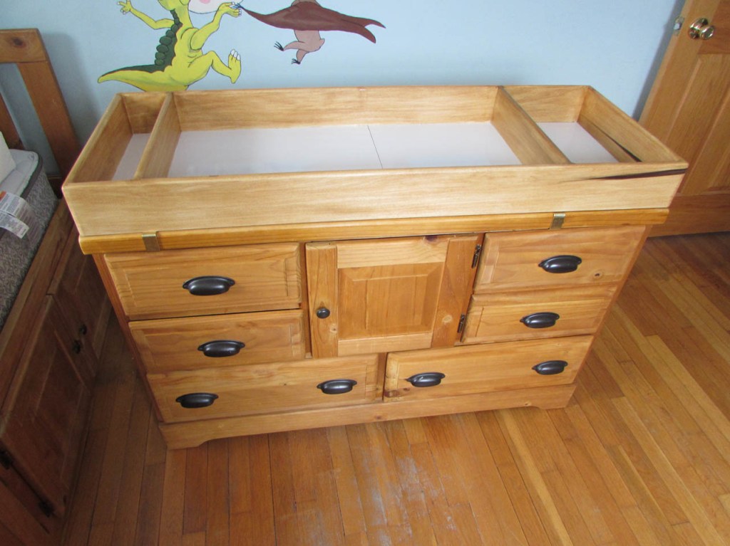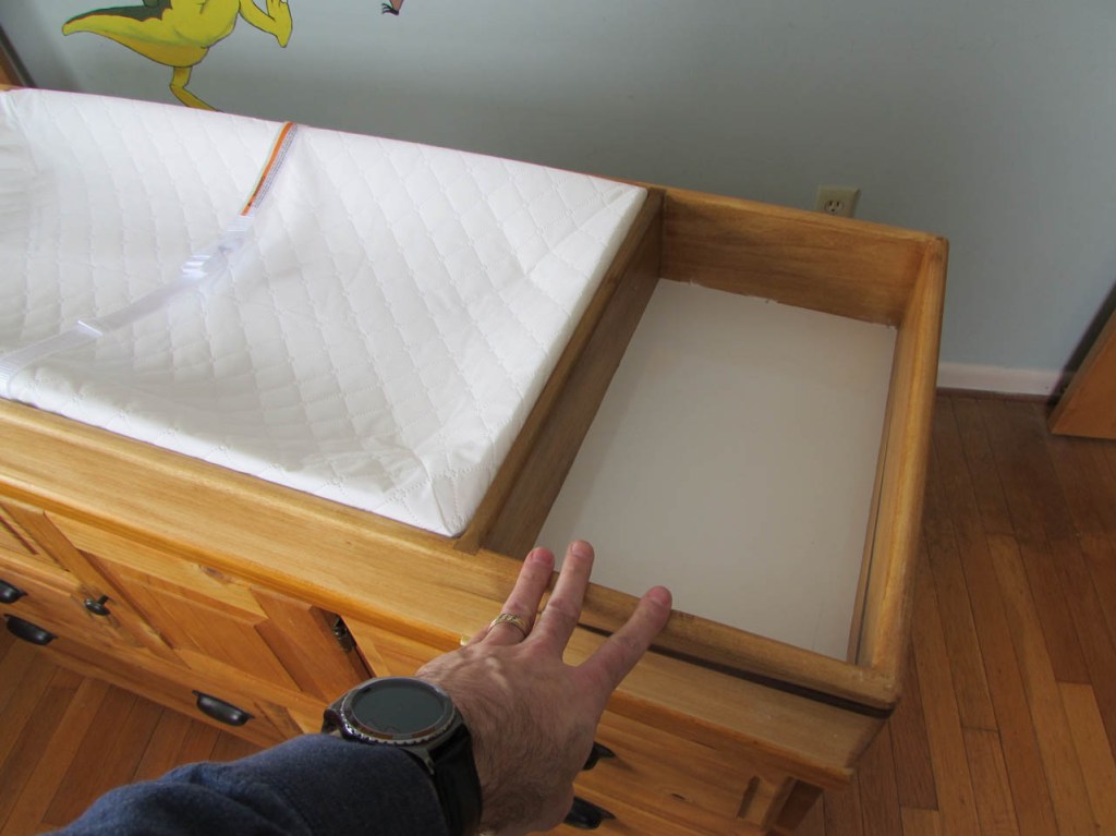 I remember twenty-something years ago when my wife and I had our first child. We were still renting but looking to buy a home and on top of that we had to acquire a few essential pieces of furniture for the baby. Cradle, crib, swing, changing table, etc. On top of that we had to find a place for it all. Then once you have everything, things change again and your child has grown out of all of those things. But do you get rid of them or are you having more kids? My boys are now men and all starting to figure out their own lives. I already have two married and one grandchild so far. I was thinking about the problem of baby furniture and had an idea for one of my boys. His old bedroom furniture was left behind because it doesn’t match the furniture in his new bedroom. Looking at the dresser, I thought it would make a perfect changing table with plenty of room to store diapers and clothes. Of course there are no safety features to prevent things from falling off the top, including the baby. But, it wouldn’t be that hard to make a removable frame that could safely function in that capacity.