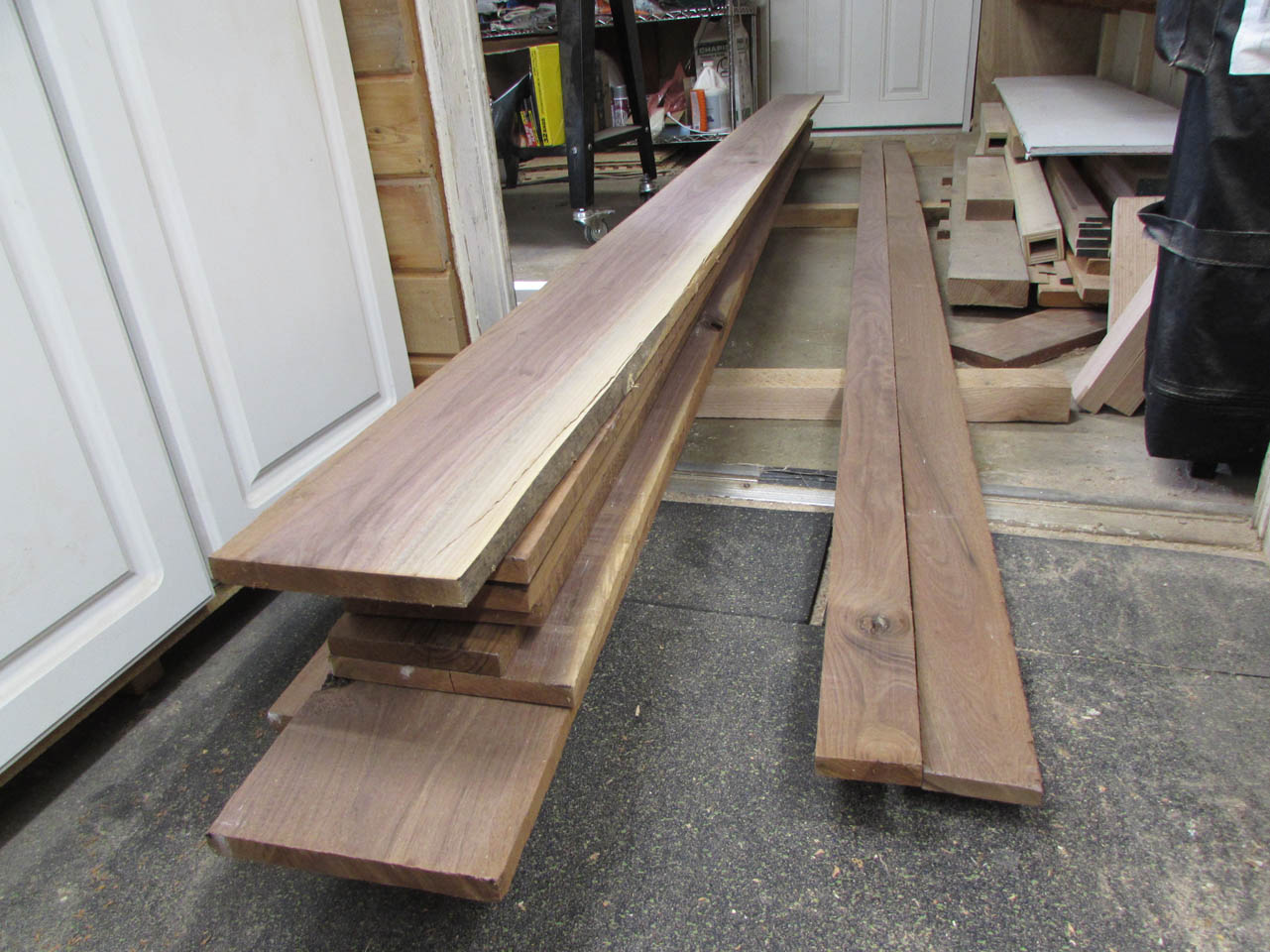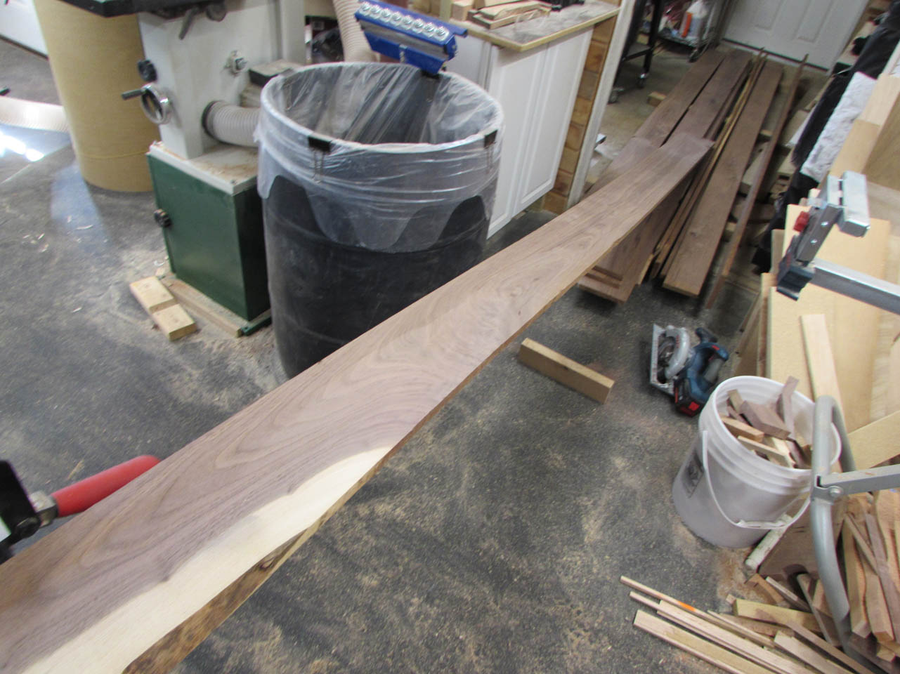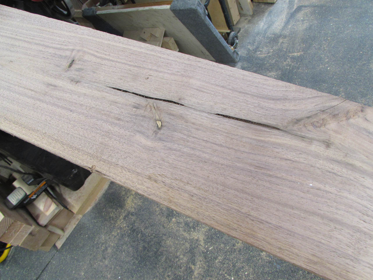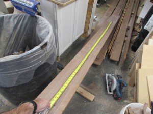 Since we were looking for mostly brown, straight grains, I had to cut away large white sections. Also, since the boards are on the thin side for a 72″ long shelf that will support books, I stayed away from swirly grain. It tends to be unpredictable and may warp.