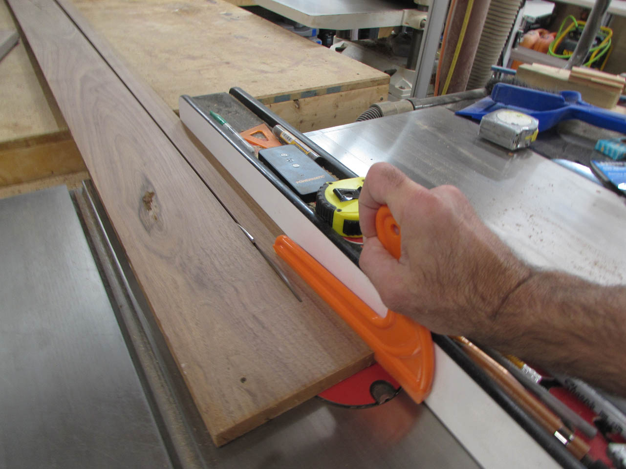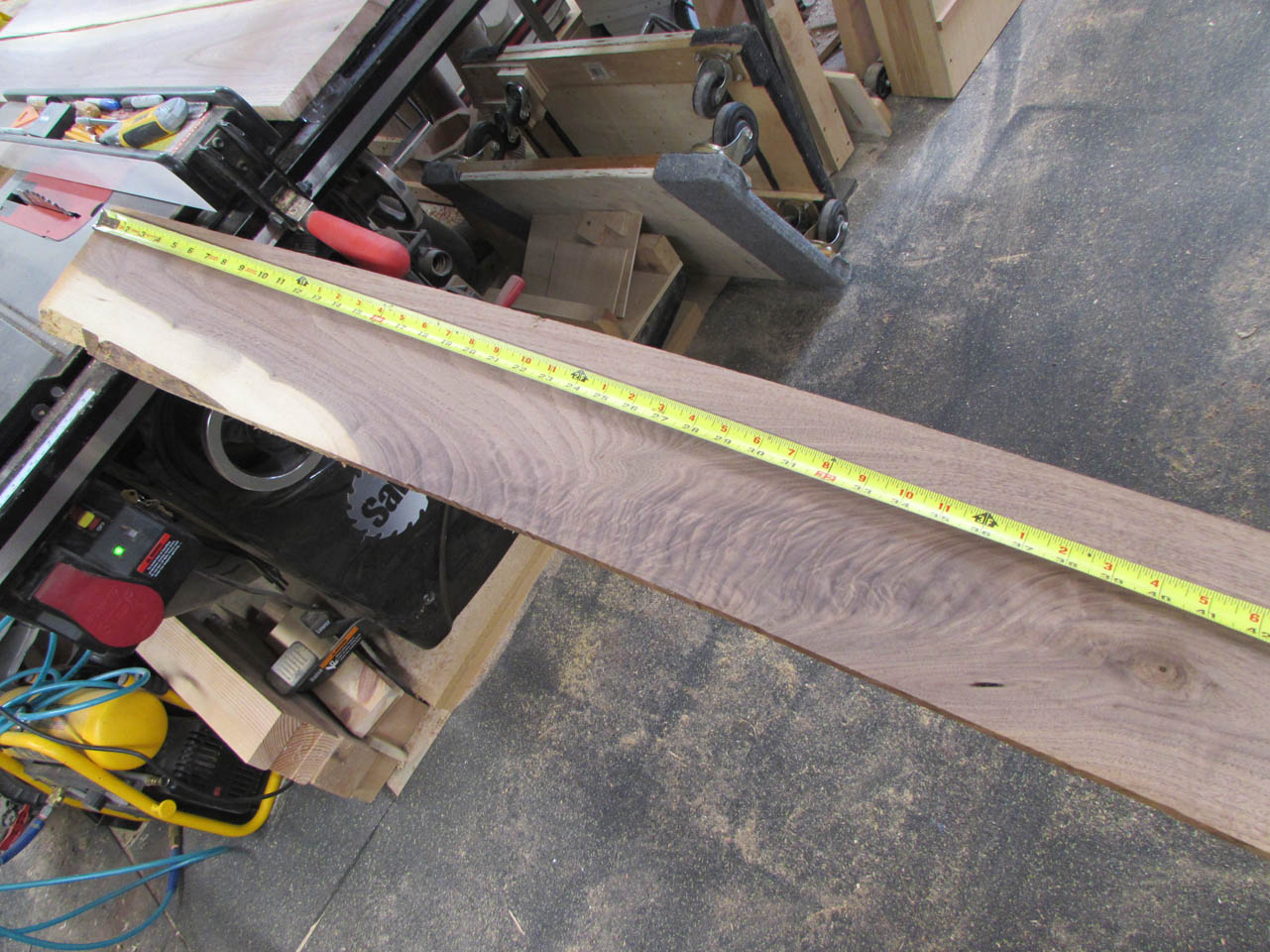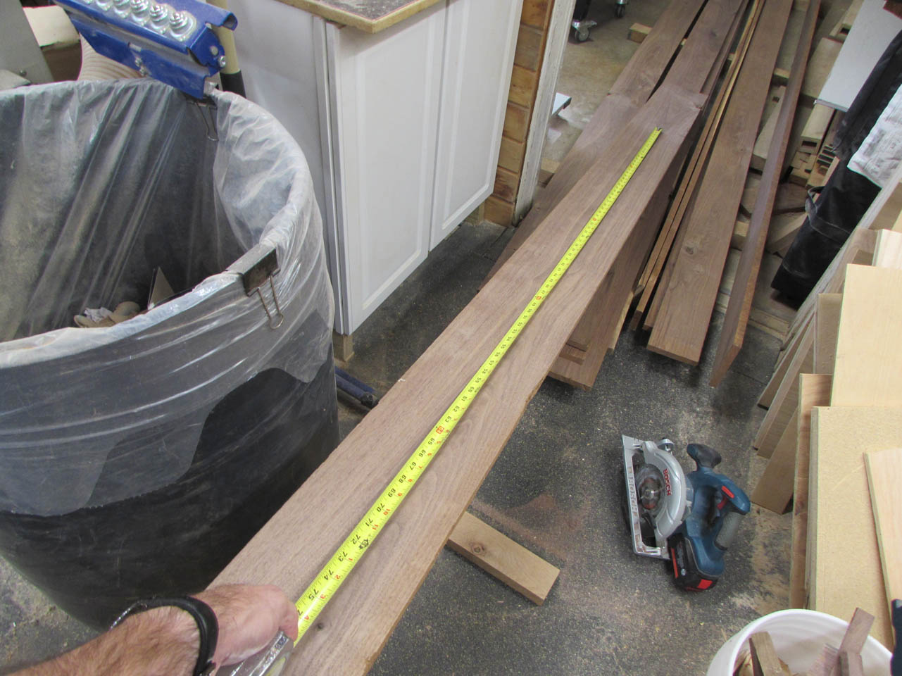 Since we were looking for mostly brown, straight grains, I had to cut away large white sections. Also, since the boards are on the thin side for a 72″ long shelf that will support books, I stayed away from swirly grain. It tends to be unpredictable and may warp.