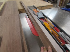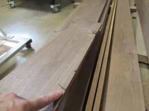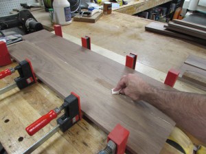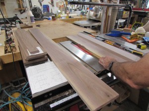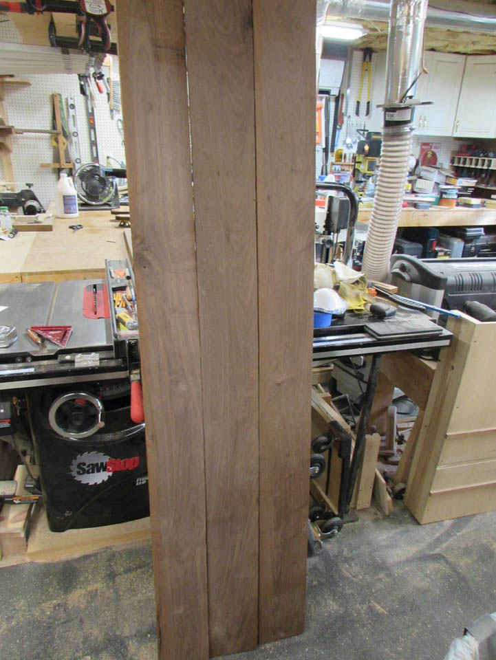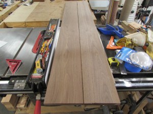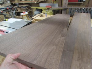 My top shelf is 14-1/2″ wide and the two lower shelves are 13″ so I had to find enough clear grain to make up panels wide enough for each.