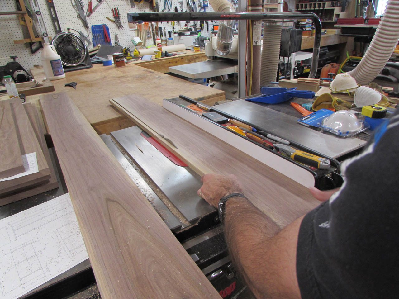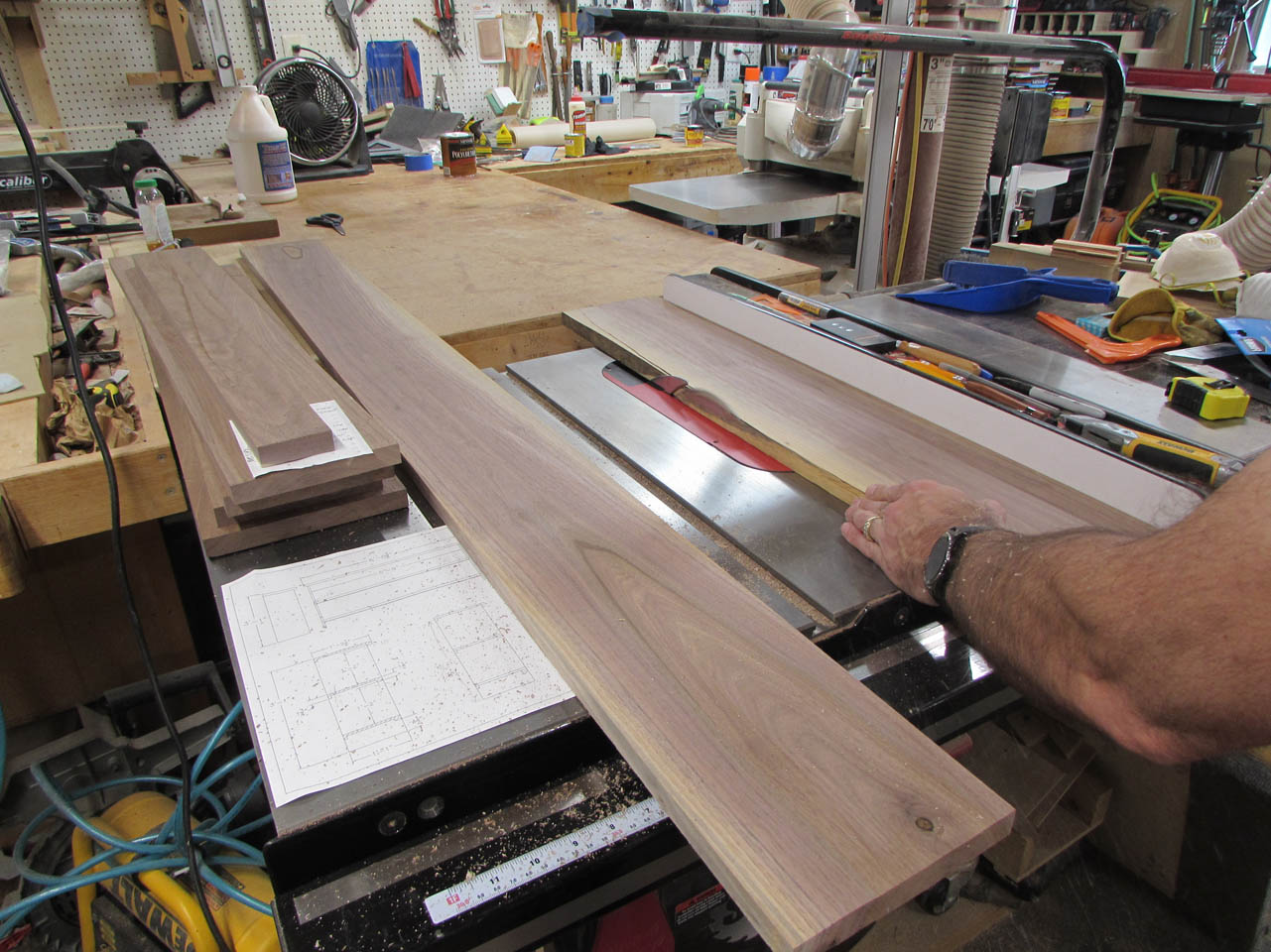 My brother asked me to make him a walnut shelf for his kitchen. He wanted it to be 72″ wide to fit directly under some wall cabinets. He also wanted the top edge to have a large ogee to match his countertop. He had a few pieces of walnut that he wanted me to use. They ranged from 3″ wide to 7″ and they were already planed down to 3/4″ thick. After getting a few more dimensions, I came up with this plan: SHELF.pdf