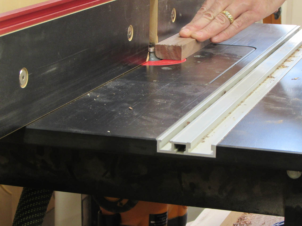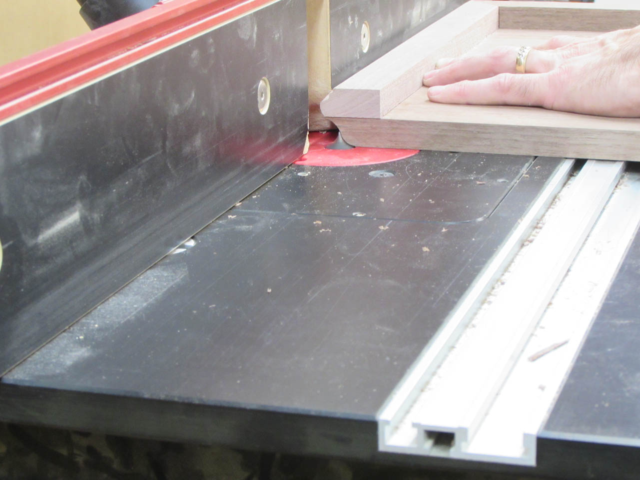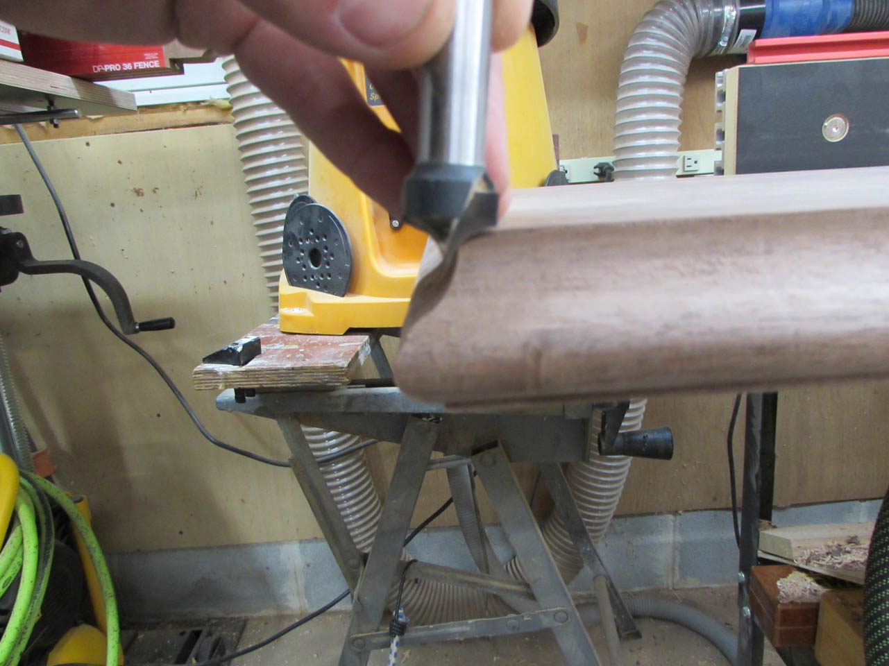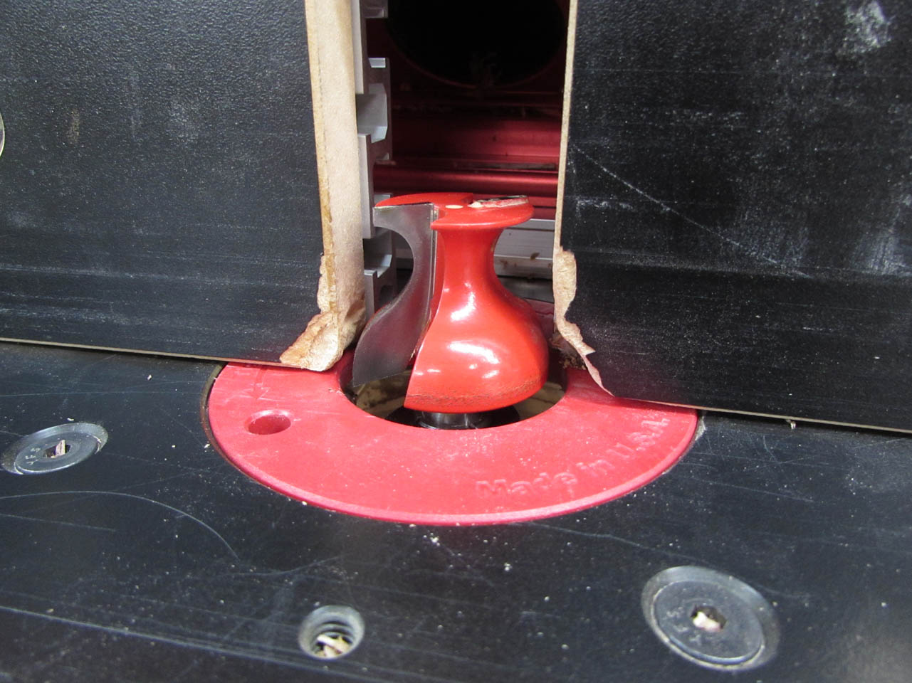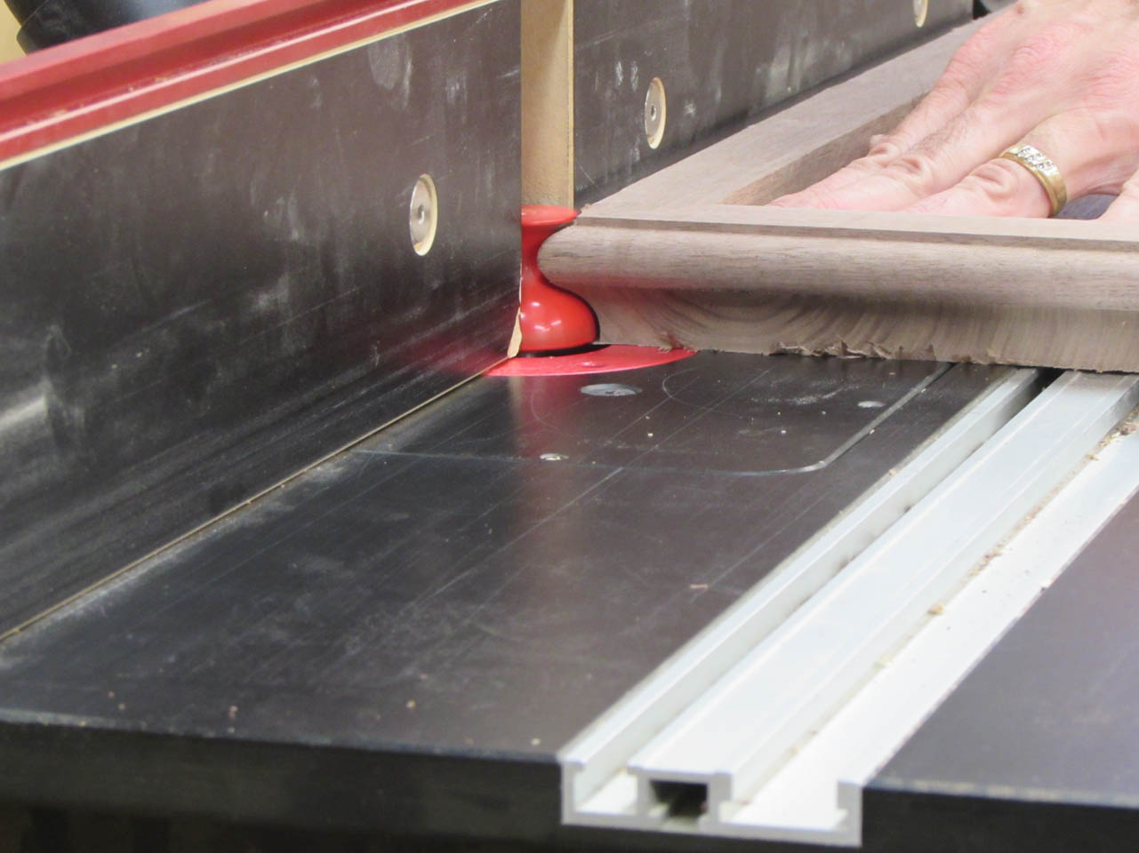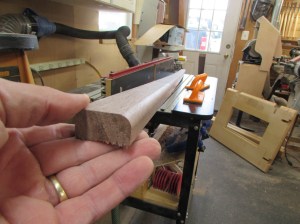 Since the last cut would interfere with a bearing bit, I have a round-over bit, with no bearing. It is usually used for cutting a double radius through the middle of a board but if I set the fence at the right spot, it may cut the radius that I need.