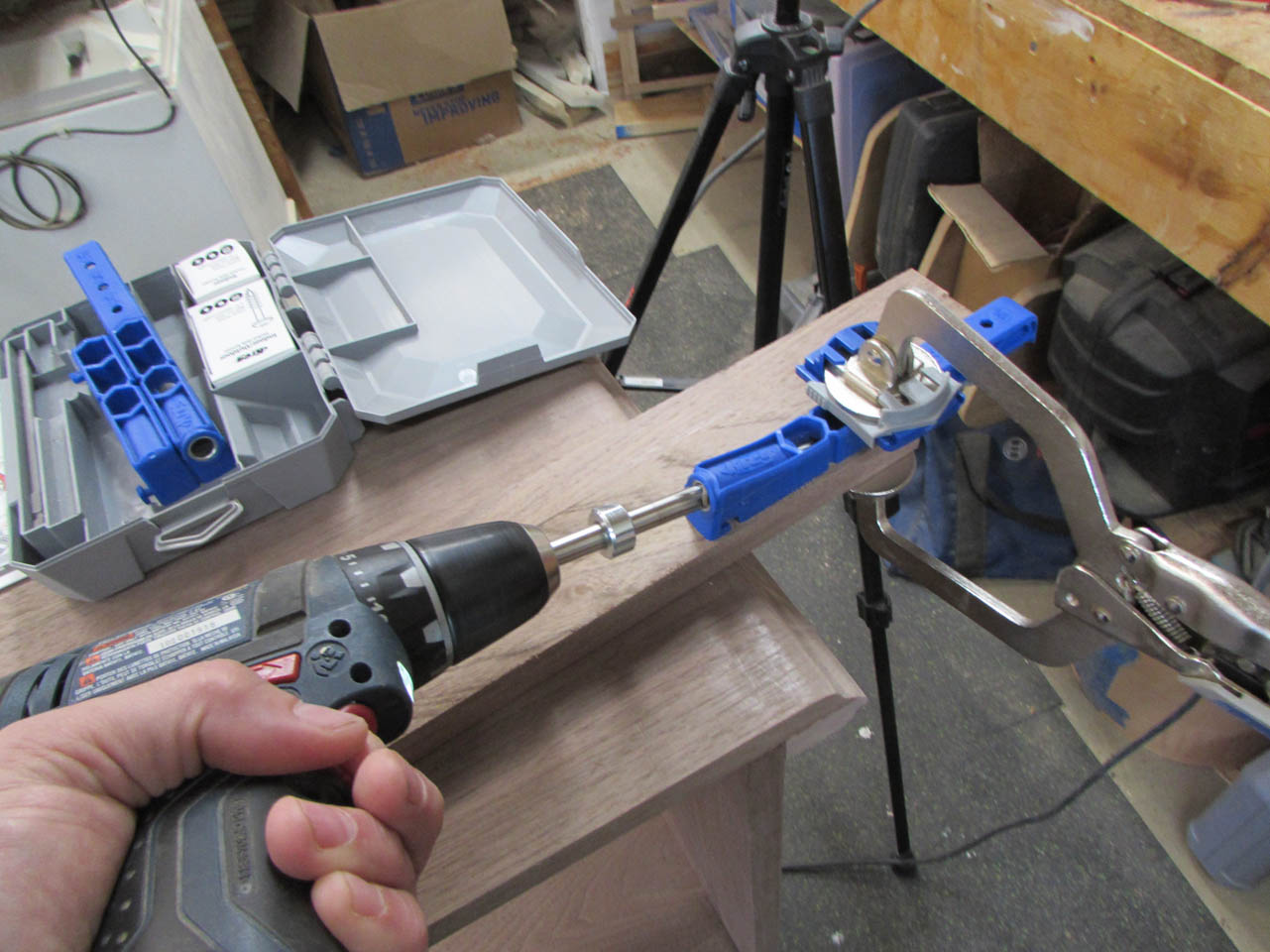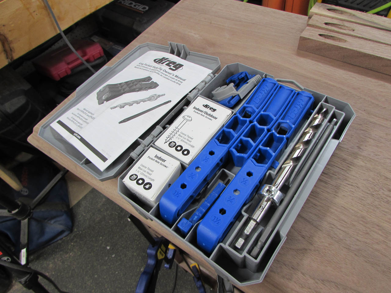 I have the full size Kreg pocket hole jig, but it is not easy to use on really long boards so I picked up this smaller version that you can just clamp to the end off the board. It works really well.