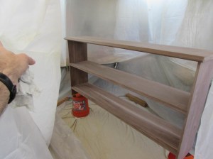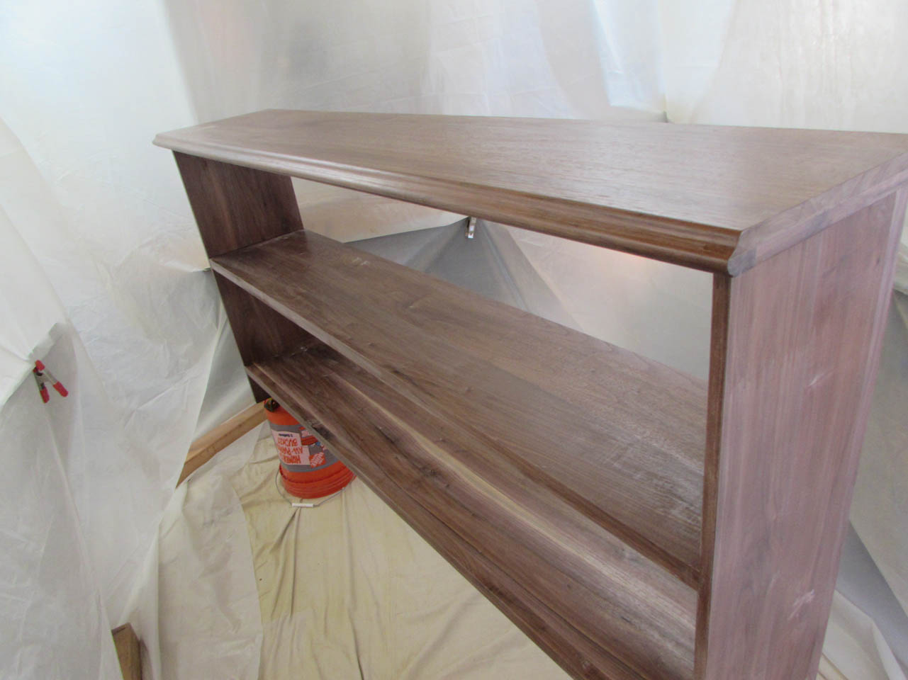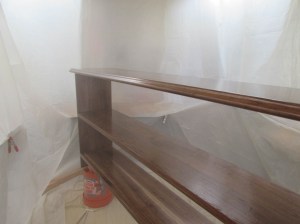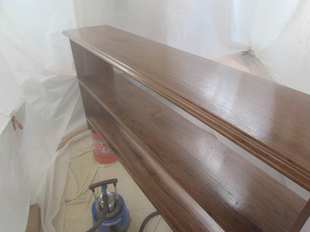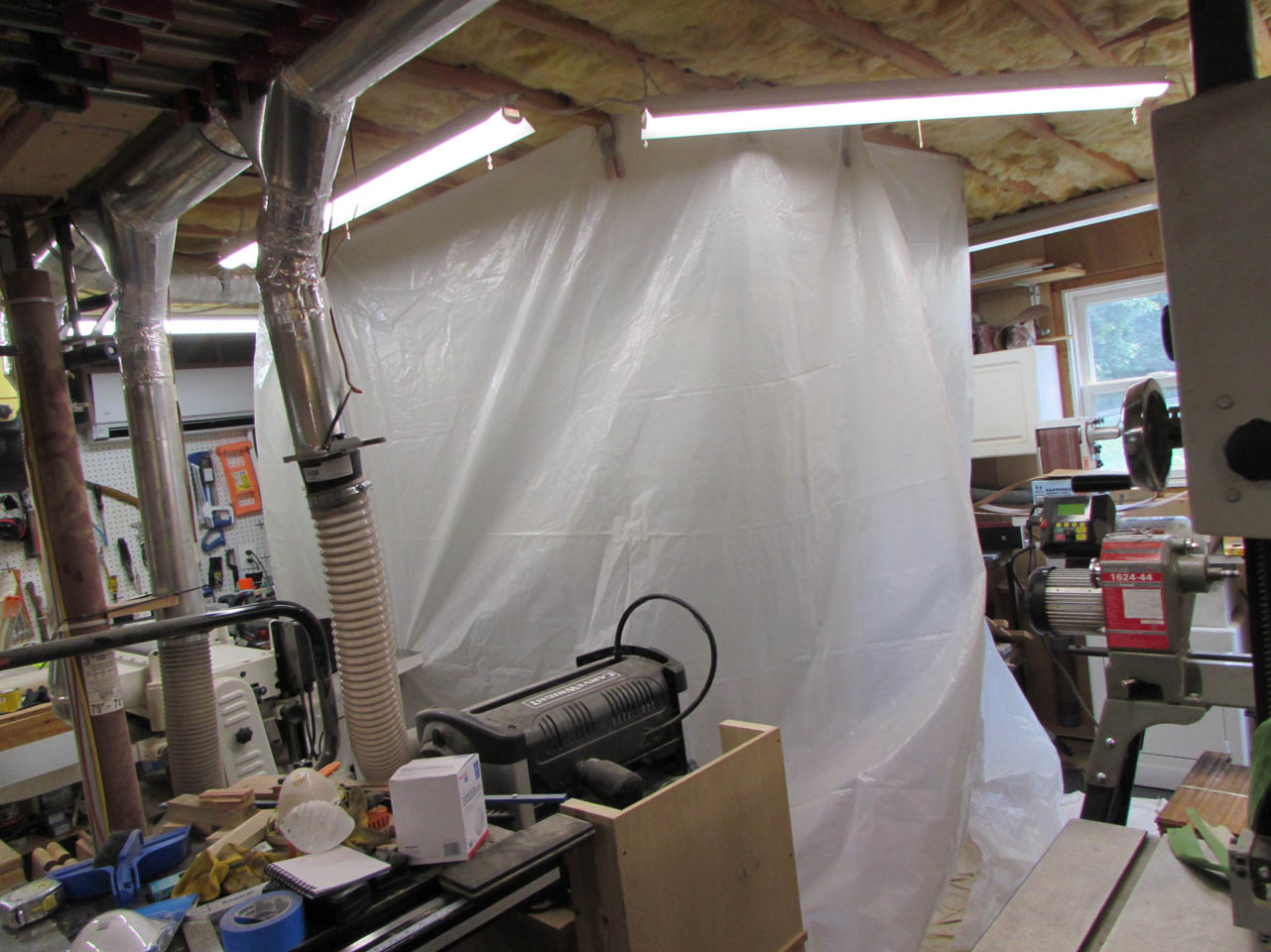 The shelf is done so I set up my temporary spray booth by clamping plastic sheets to the ceiling.