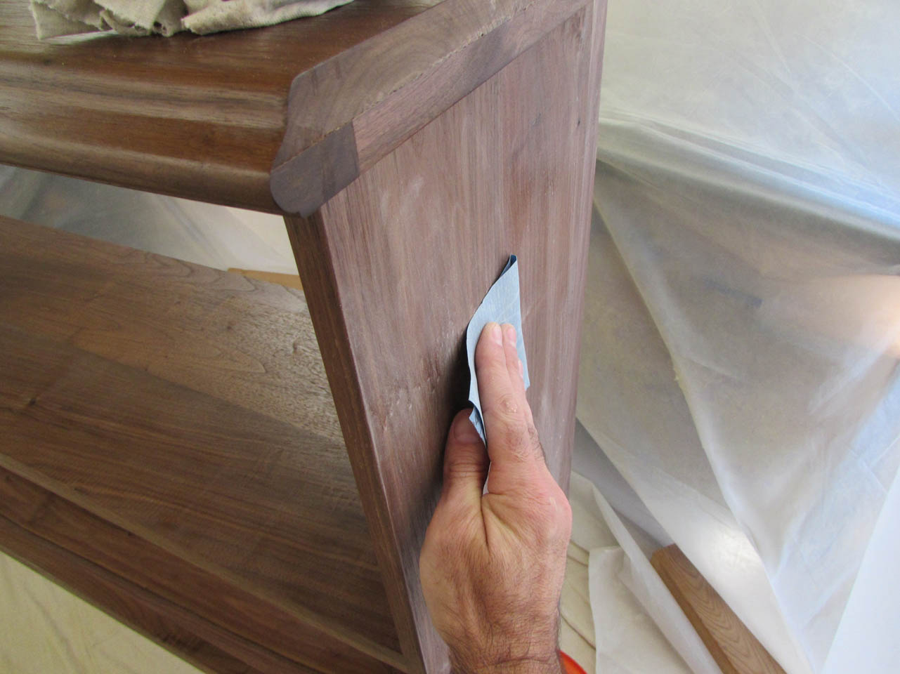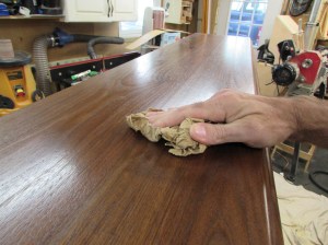 After the first coat dries, I sand all the surfaces with 400 grit paper to remove any rough spots or dust.