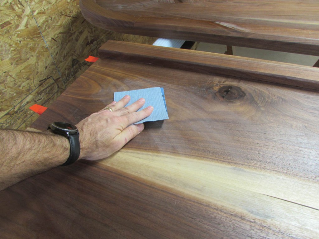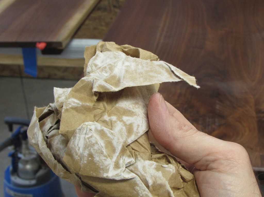 After the third coat has dried, I needed to buff off any remaining dust nibs or dried vaporized polyurethane that dropped back onto the surface while the last coat was curing. To do this, I crumple up a torn off section of a brown paper bag and start rubbing down the surface.