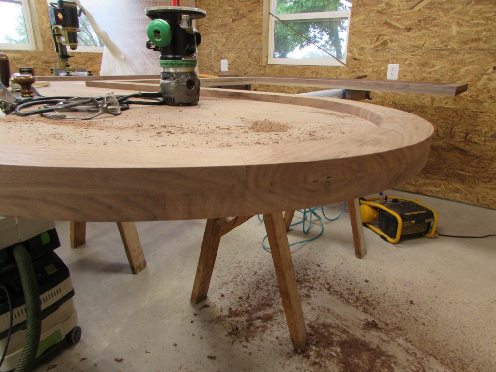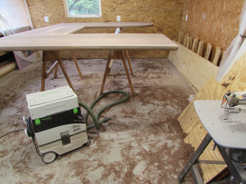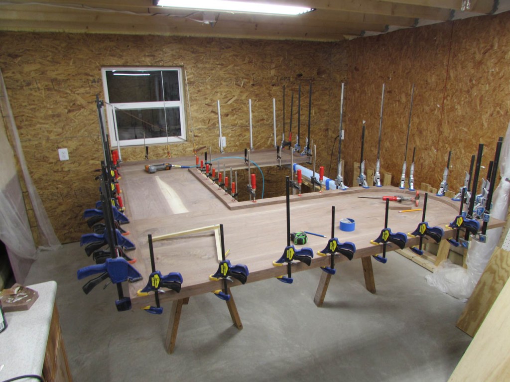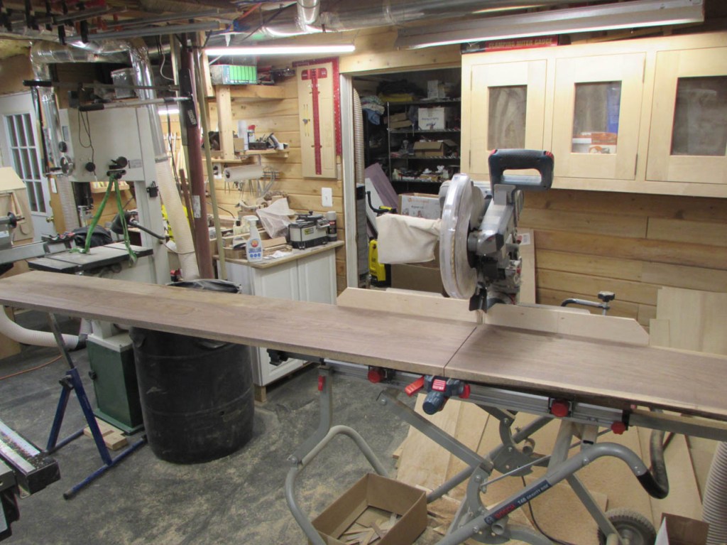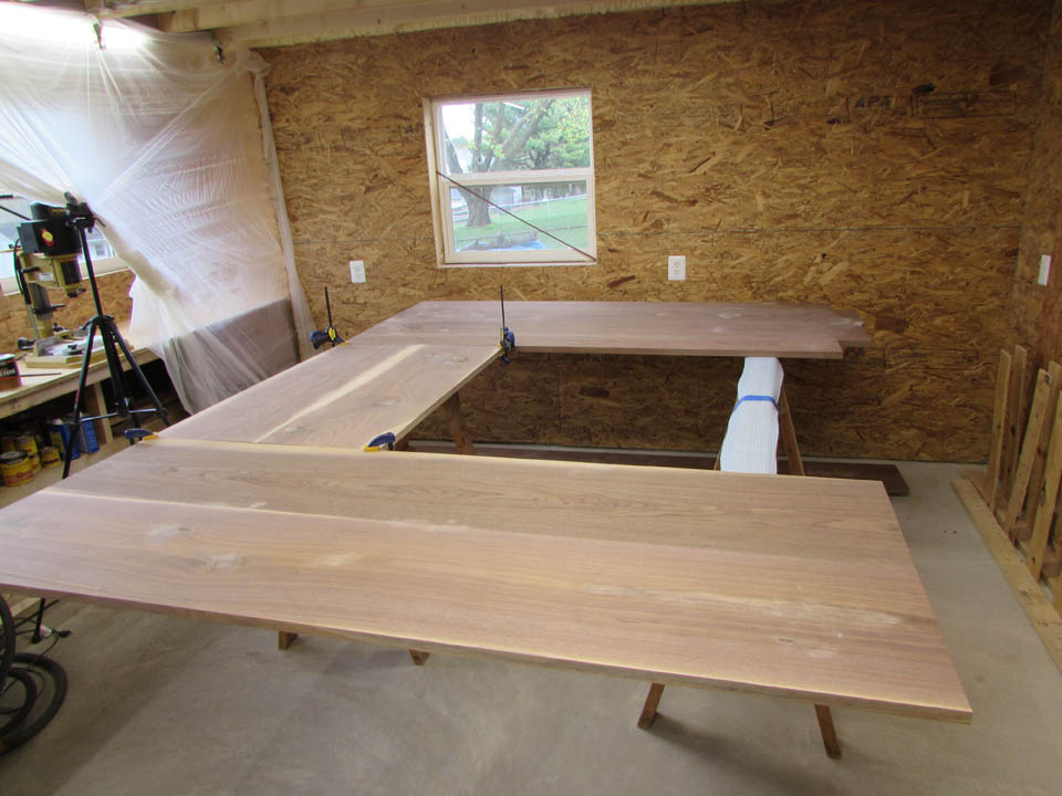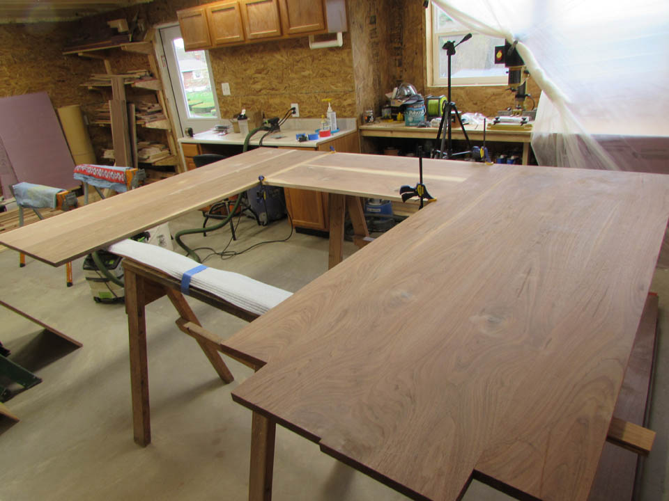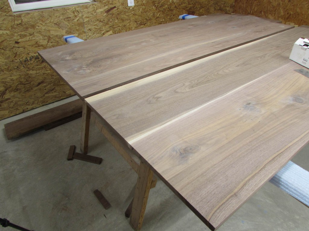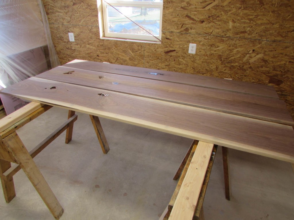 My wife took pity on me and came down to help sweep and vacuum the area. I adjusted the saw horses and placed the tops on them, upside down. In case you were wondering, to extend the length of the saw horses, I screwed two 8′ long 2″x4″s on edge, then wrapped them with some left over foam sill sealer. This gave me a soft surface to avoid marring the finished walnut. And, yes, I did learn that you need to leave the heaviest section in the middle or the entire thing will fall over if you remove too much weight from one side. I did not take a picture of that lesson…